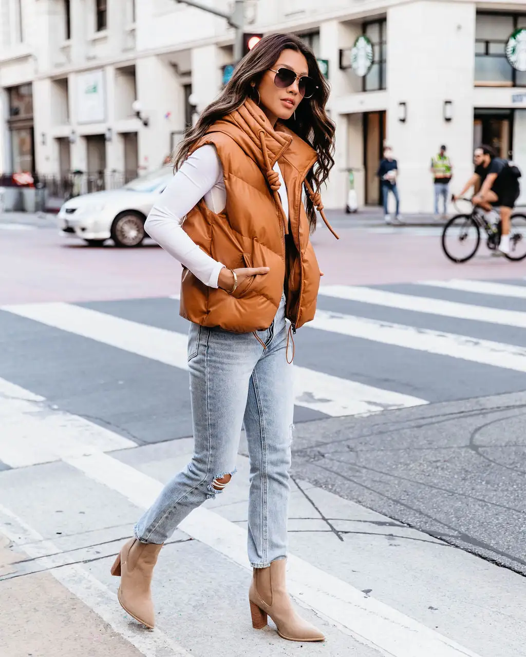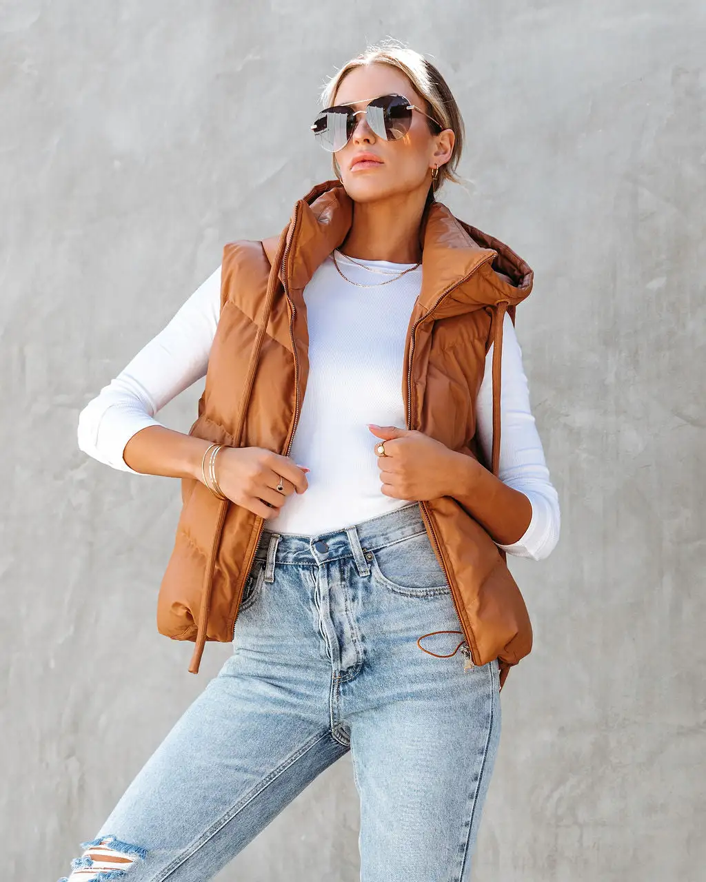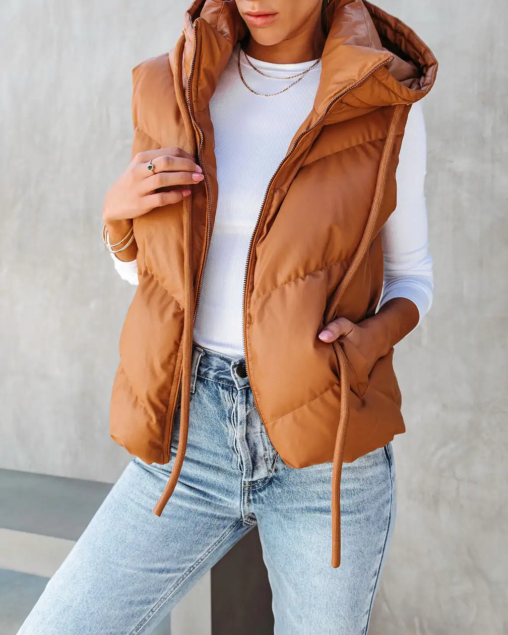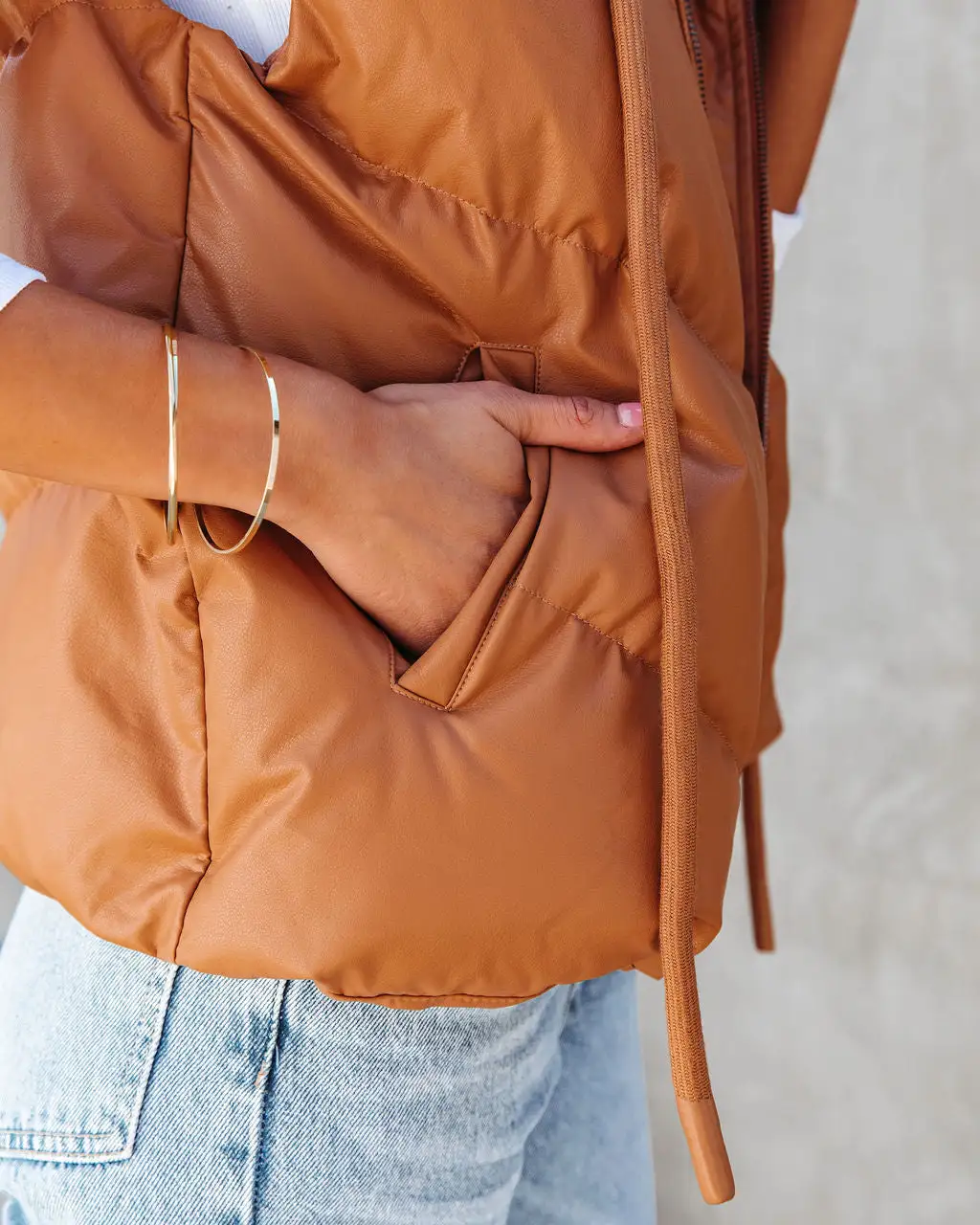 Add a layer of warmth in the Shelton Pocketed Hooded Faux Leather Puffer Vest in camel that features an adjustable waist tie.