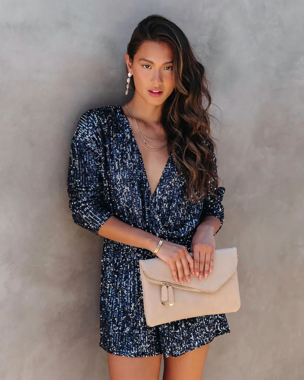 Go for glam in the Shine Bright Sequin Romper in navy that features a draped neckline.