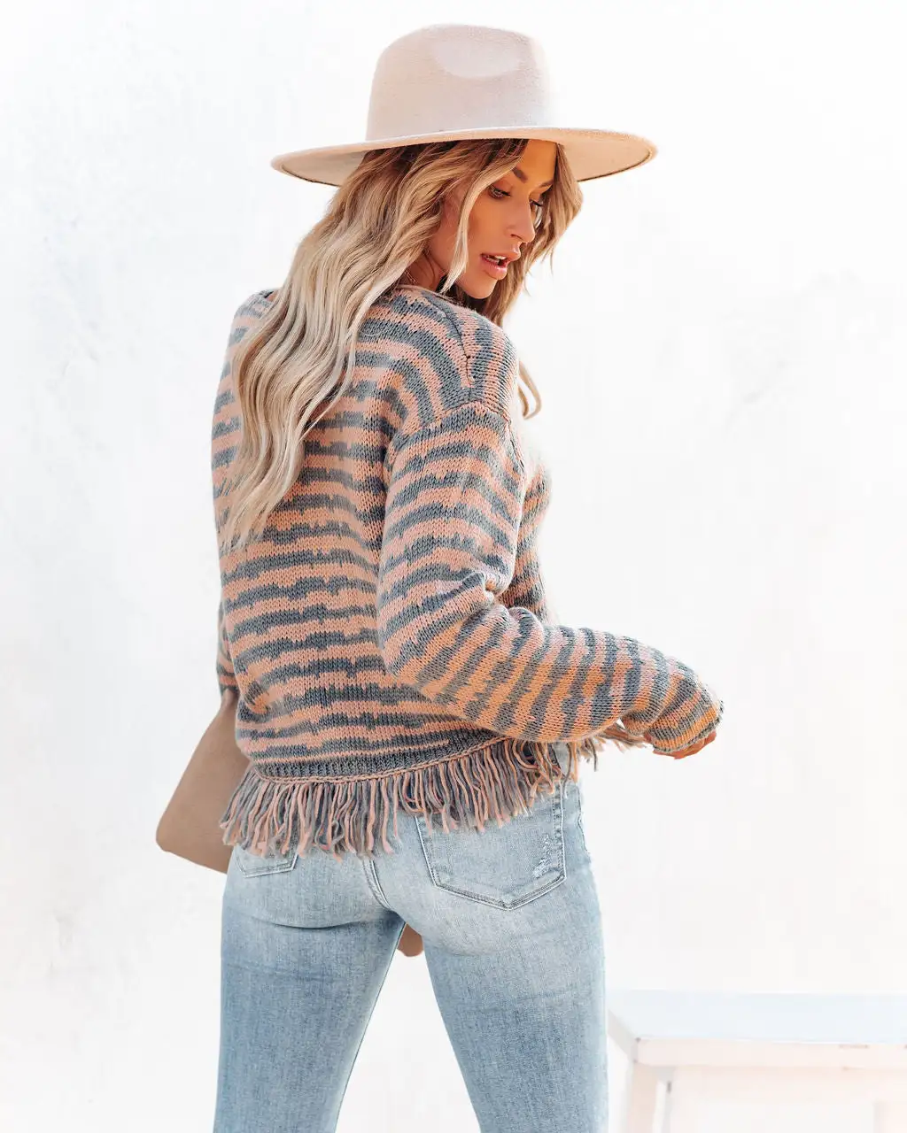 Get back to the office in our Simple Times Fringe Knit Sweater! This grey and peach striped knit sweater features a fringed hemline. Designed with a wide neckline and a subtle cropped fit. Styled with the El Dorado Hat, Perfect Hoop Earrings, Chloe Mini Necklace, Republique Dual Pendant Necklace, Simple Bangle Bracelet, Mcguire High Rise Distressed Denim, Uptown Faux Suede Heeled Bootie, and Stella Crossbody Envelope Zip Clutch.