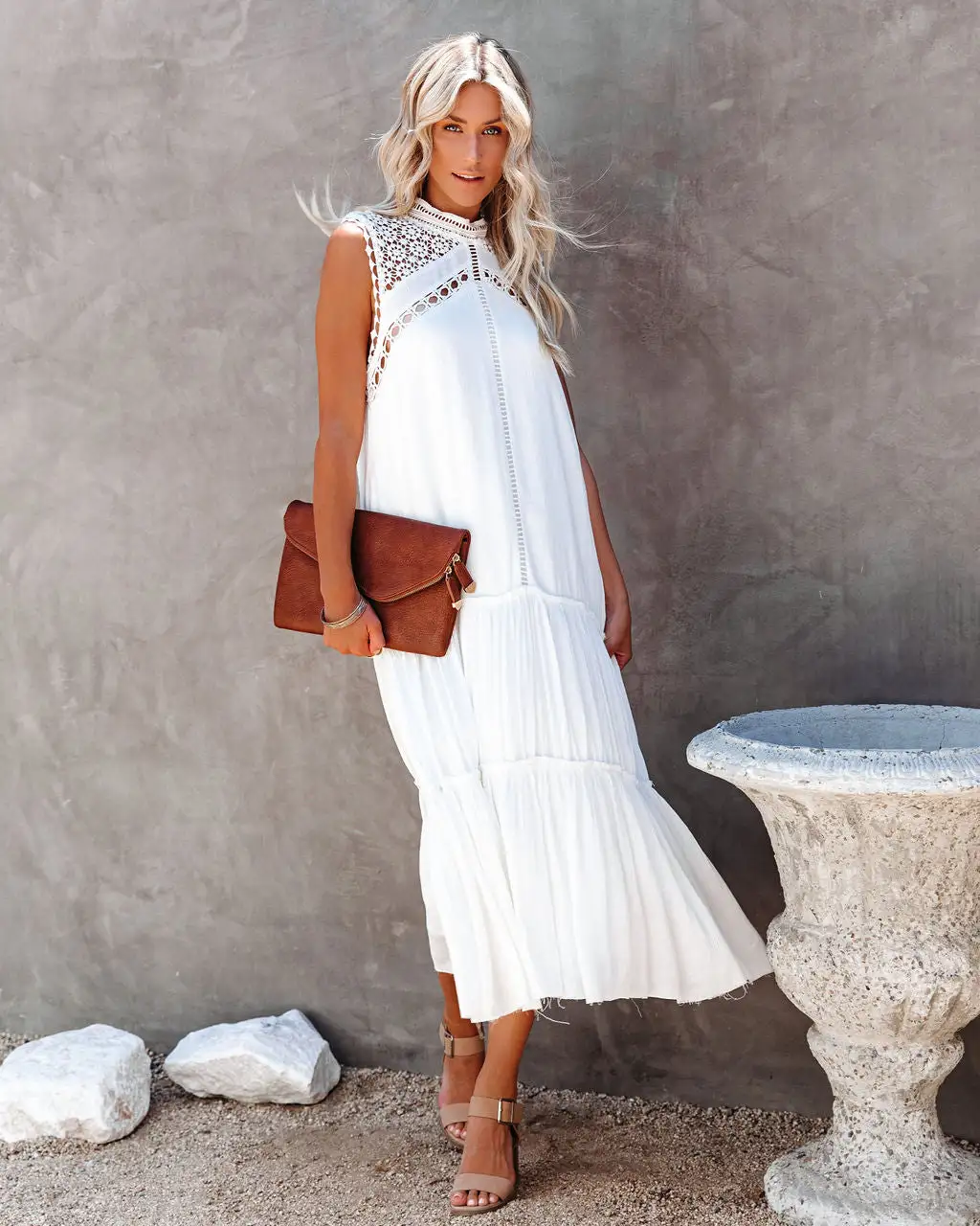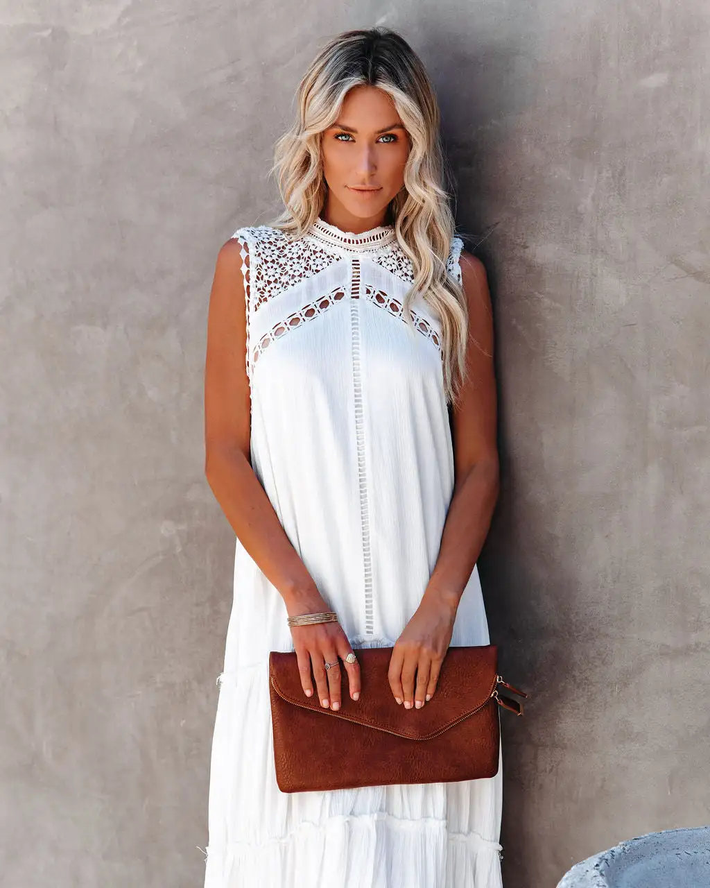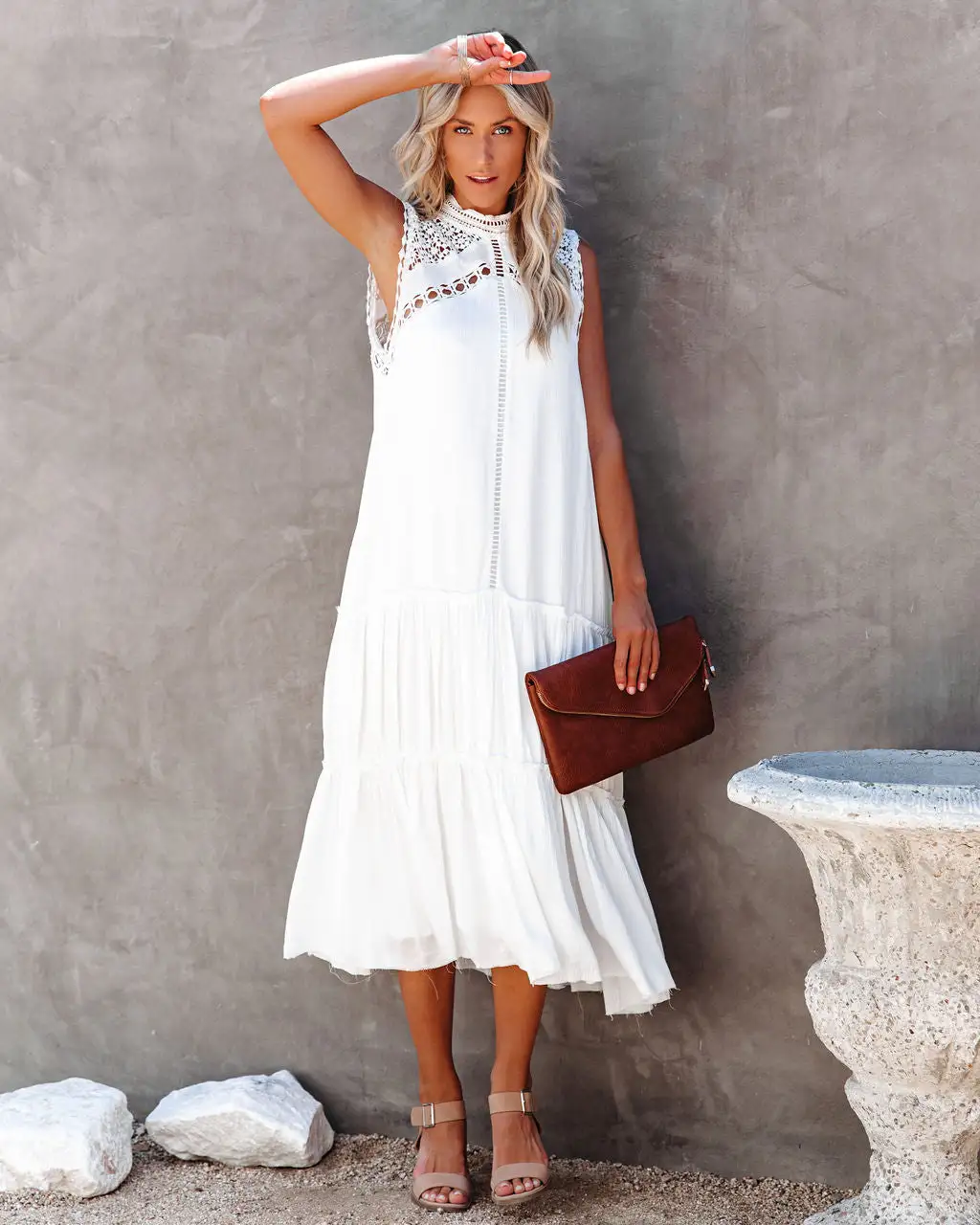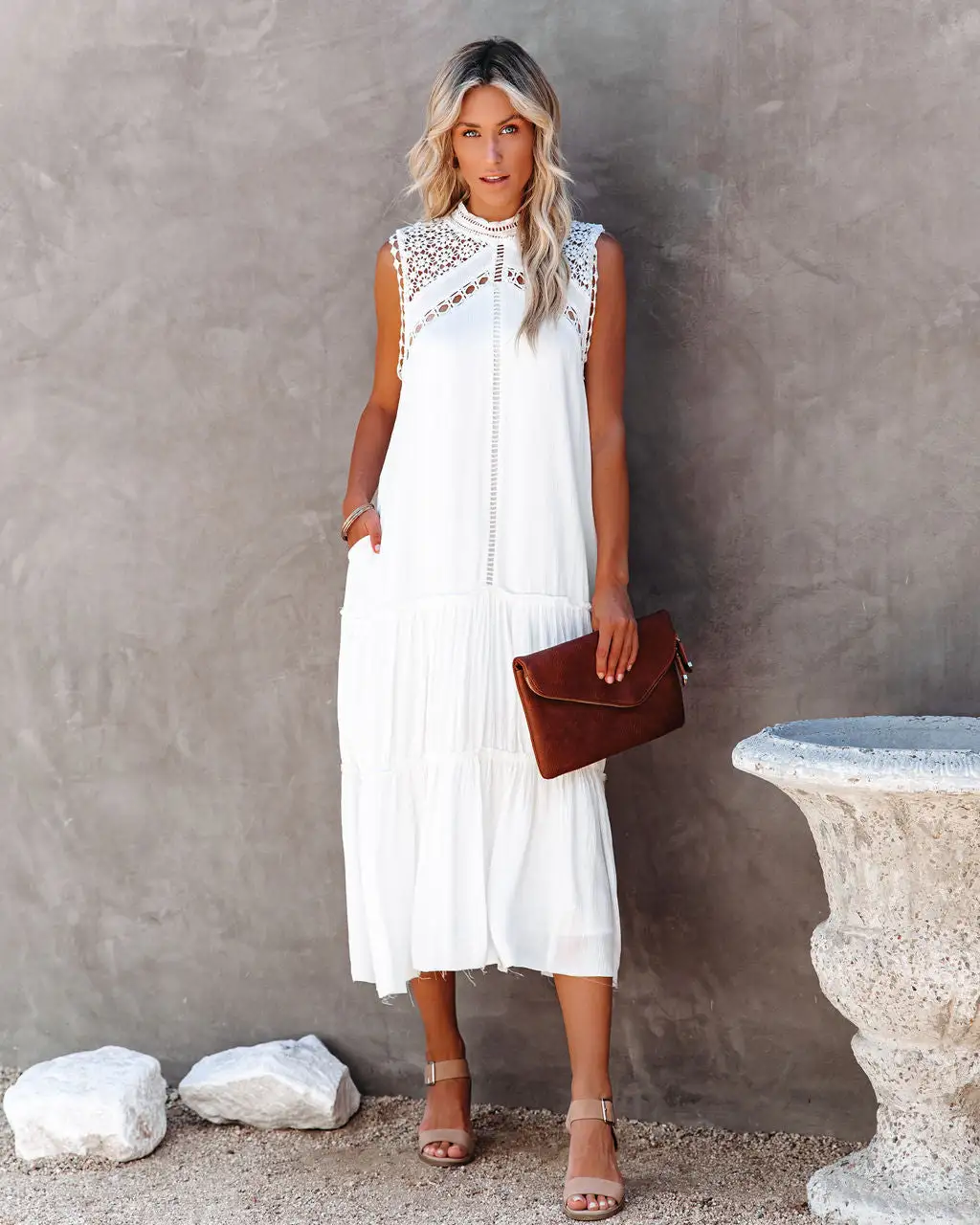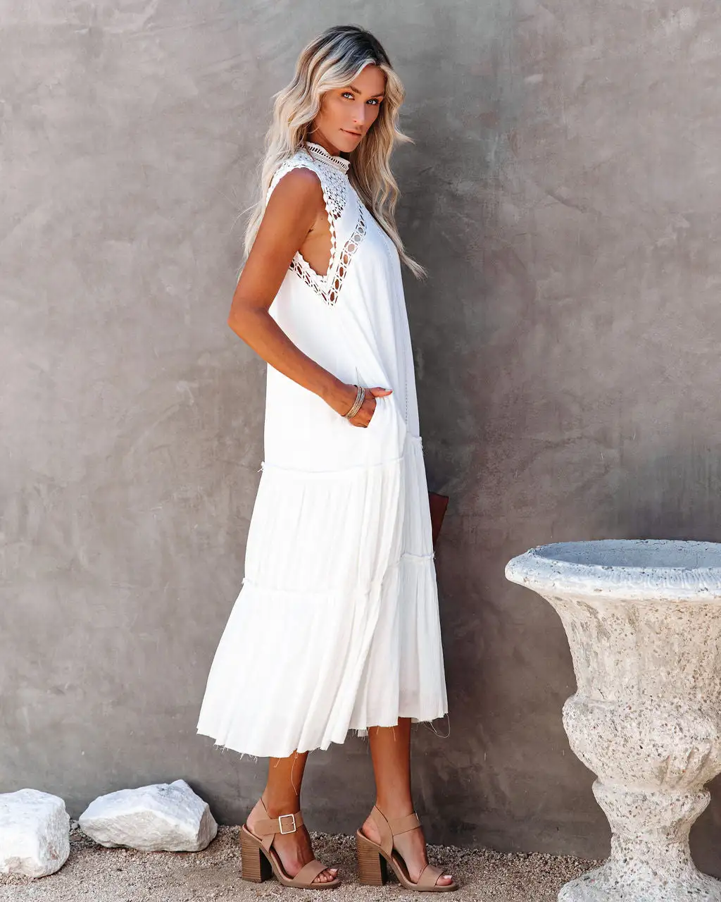 //Best Seller//New Name// Take a step back and throw on the Sizzle Pocketed Crochet Lace Midi Dress for an effortless, summer boho chic look! This fits comfortably with a relaxed silhouette, high neckline and sleeveless body. Designed with a crepey fabrication that’s embellished with a gorgeous crochet lace top and ladder lace detailing. Complete with a soft ruffle frayed skirt and hemline to finish the look. Styled with the Ainslie Hoop Earrings, Simple Bangle Bracelet, Stella Crossbody Envelope Zip Clutch, and Cooper Block Heeled Sandal.