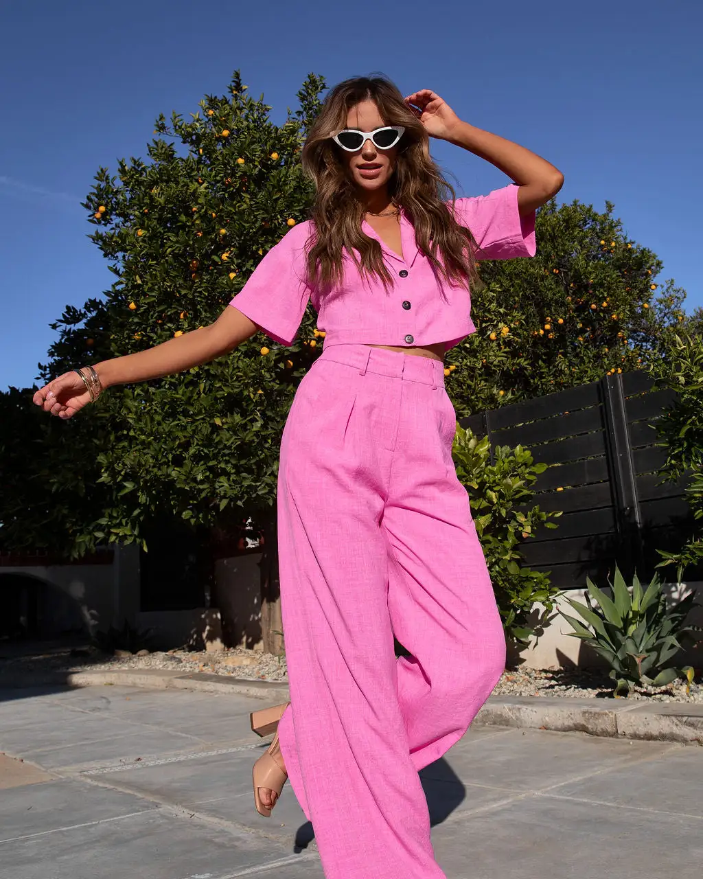 Major Barbie Vibes in the Kamilla Button Front Crop Top in pink that features a notched collar.