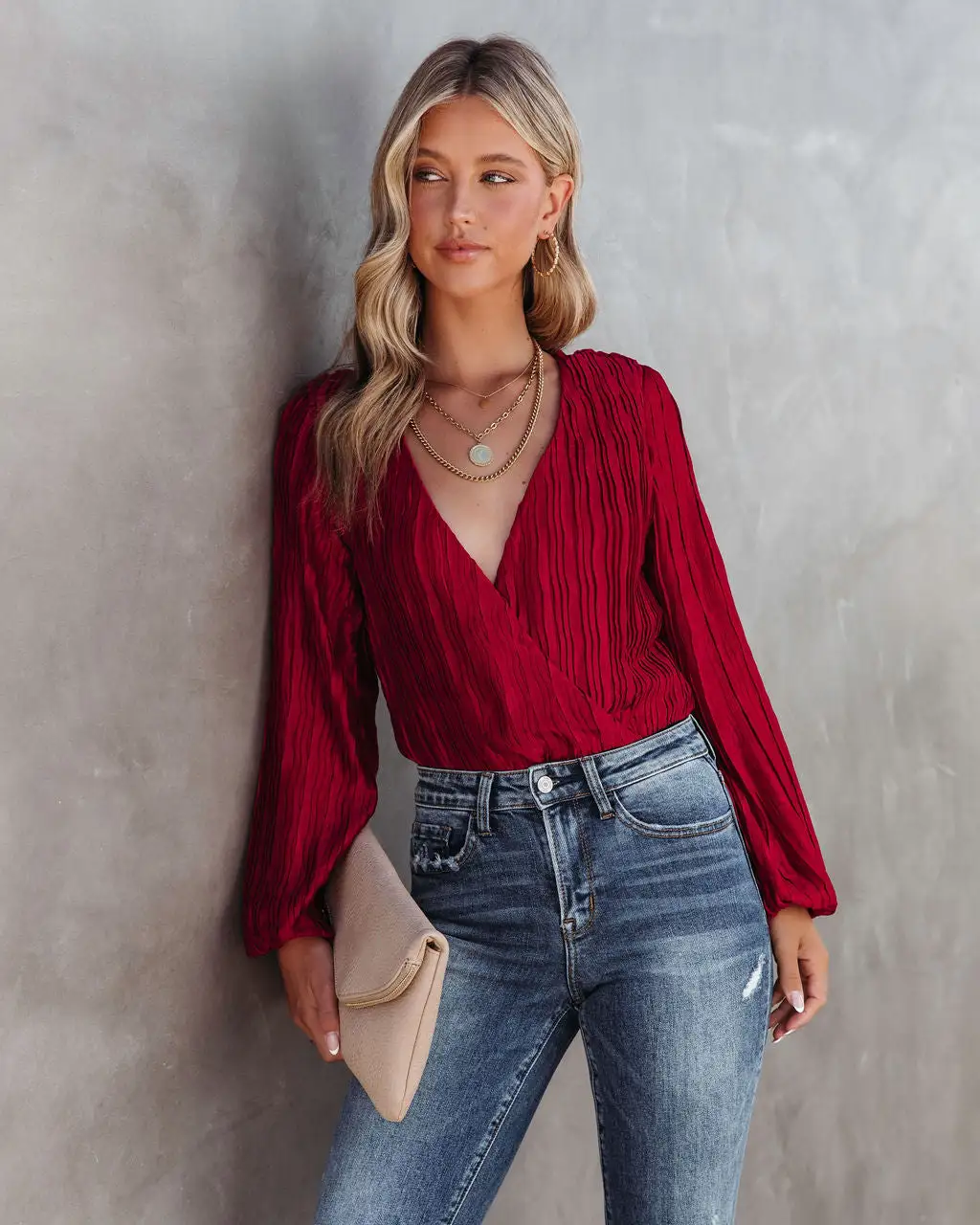 Dress up for date night in the Salma Plisse Drape Bodysuit in red that features a draped neckline.