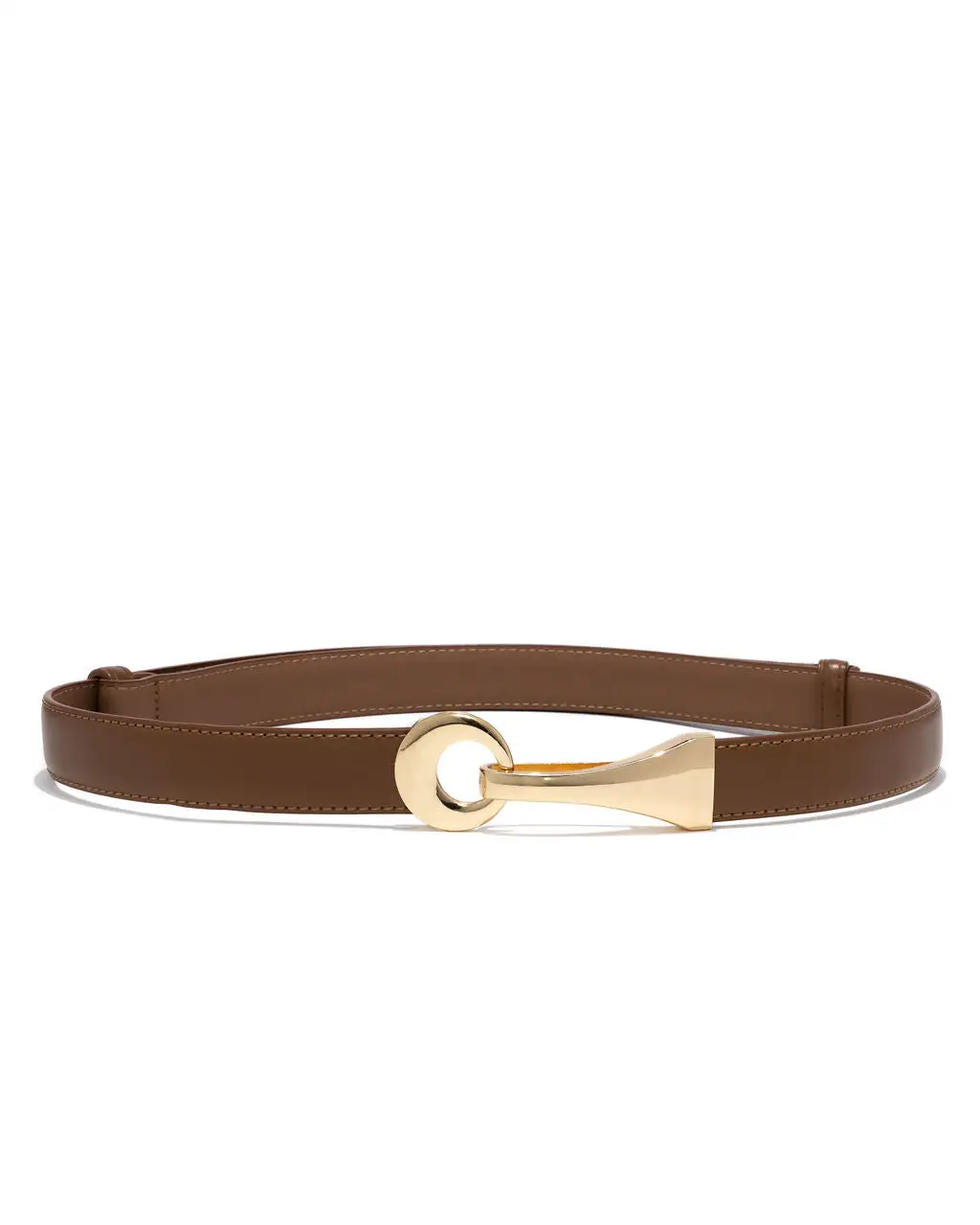 Cinch in your favorite dress or sweater in the Spencer Gold Buckle Belt in brown that features a hook detail.