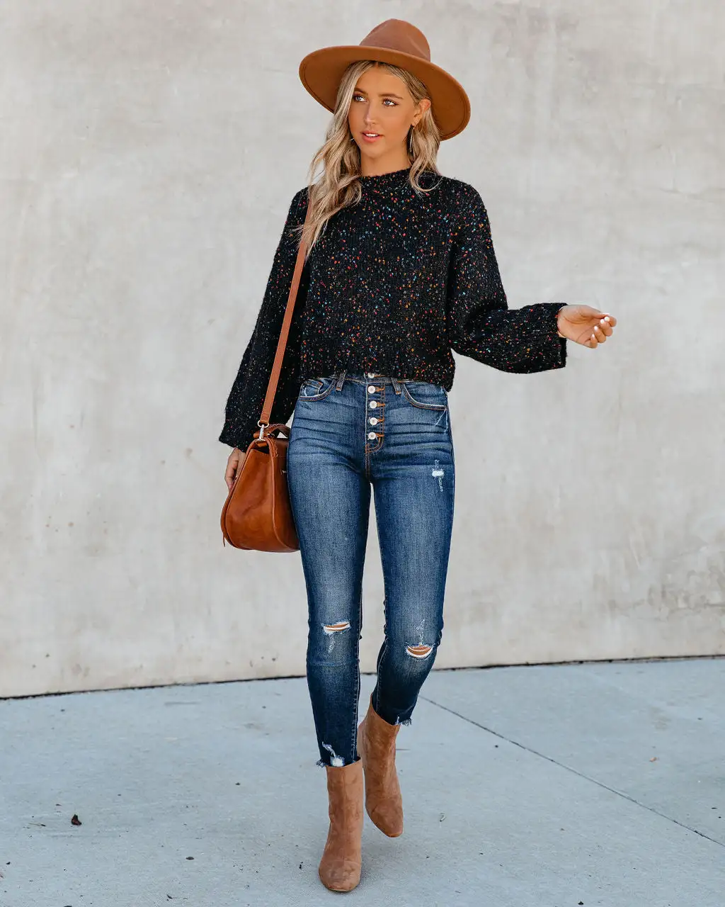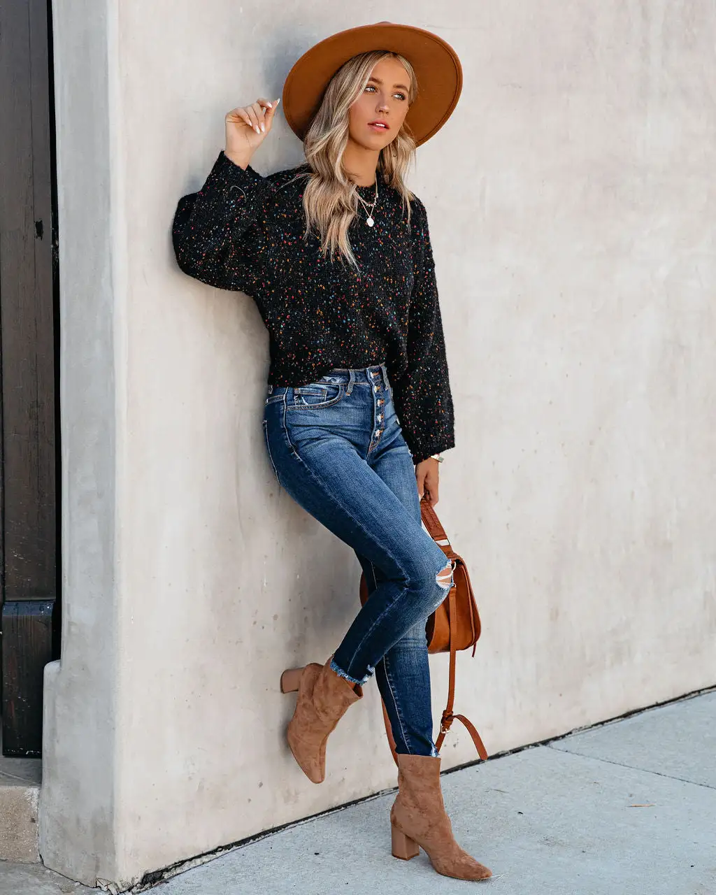 //Best Seller// New Color// Fall vibes are in full effect! Our Splash Of Color Speckled Knit Sweater is a soft + stretchy option that features a speckled yarn detail in multi colors. A crew neckline and billowy long sleeves accent the relaxed fit for a trend-forward look. Effortlessly style this cozy knit with a wide brim hat and distressed denim! Styled with the El Dorado Hat, Perfect Hoop Earrings, Simple Bangle Bracelet, Highland Bag, Tilley Frayed Ankle High Waisted Skinny, and Colby Faux Suede Heeled Bootie.