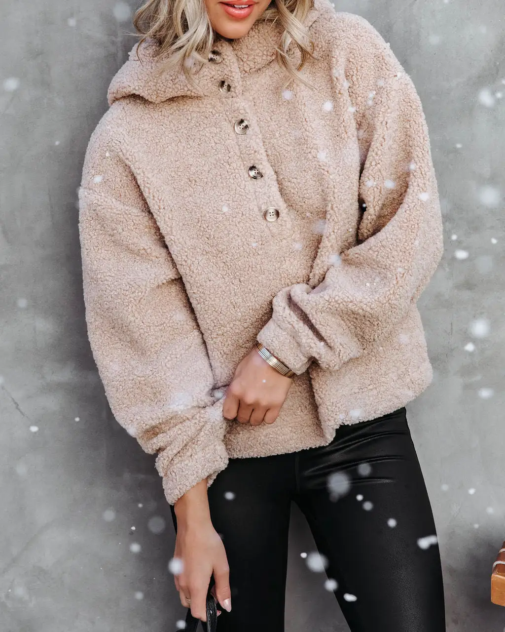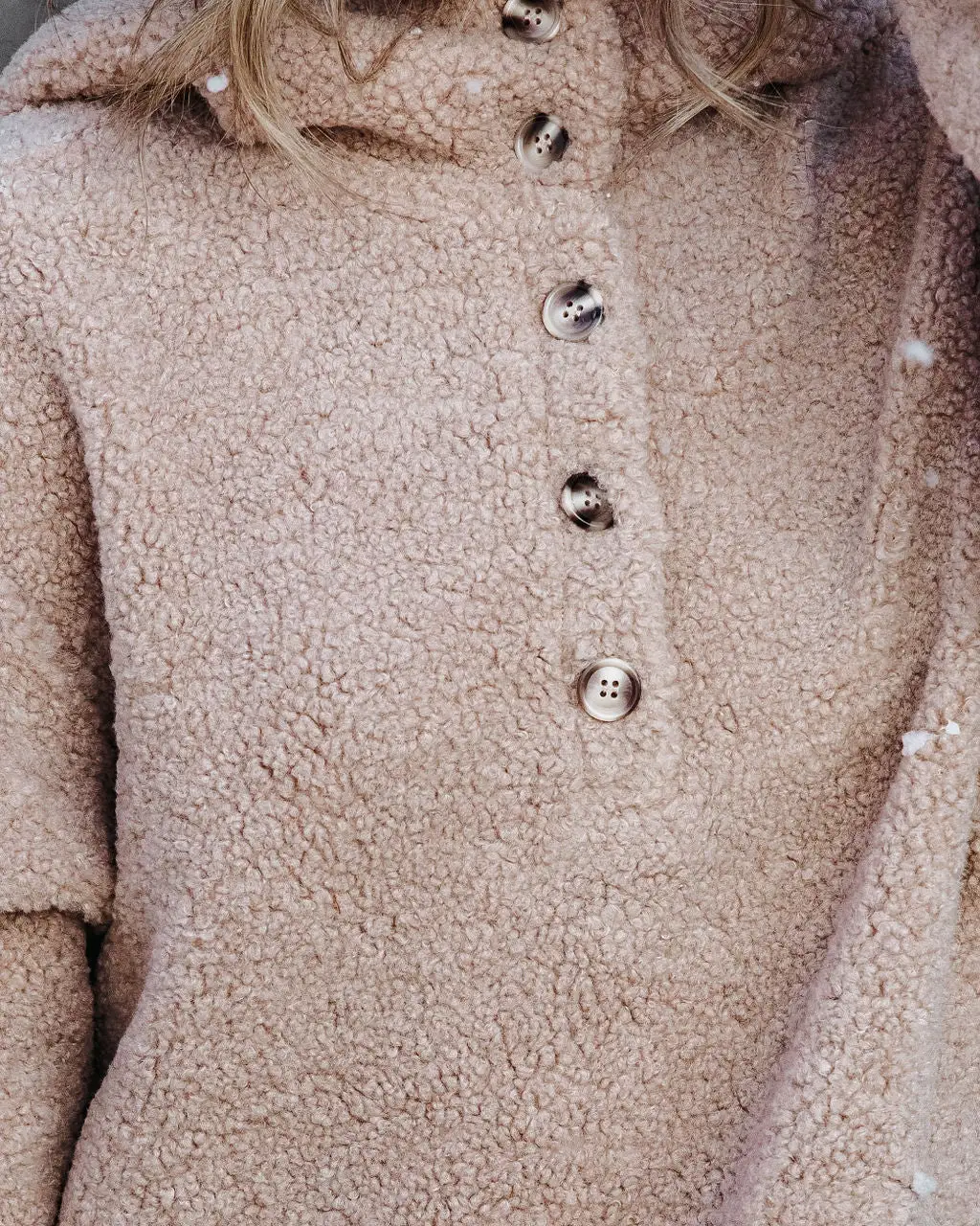 Cozy up this season in the Stone Valley Teddy Button Front Pocketed Hoodie in mocha that features side pockets.