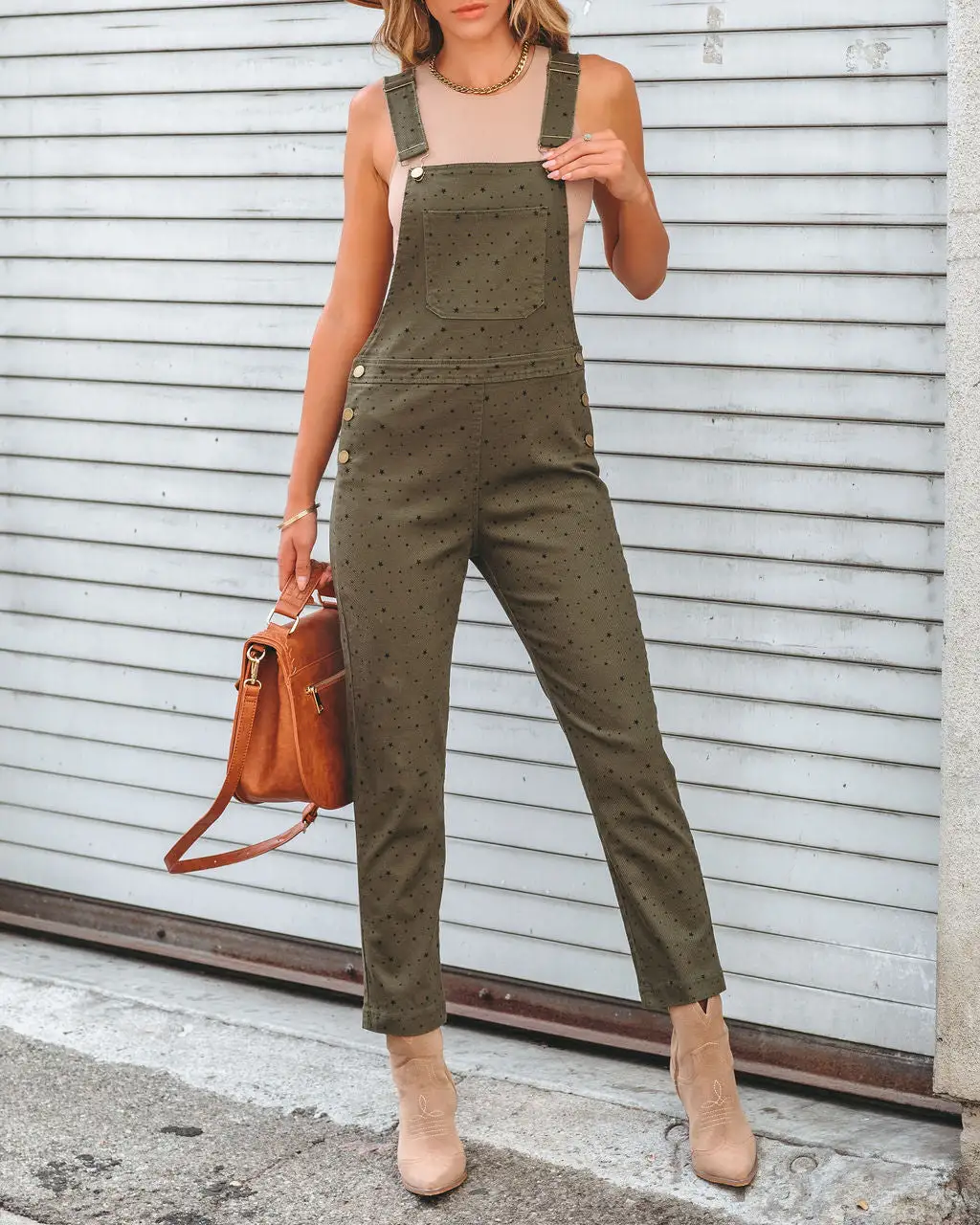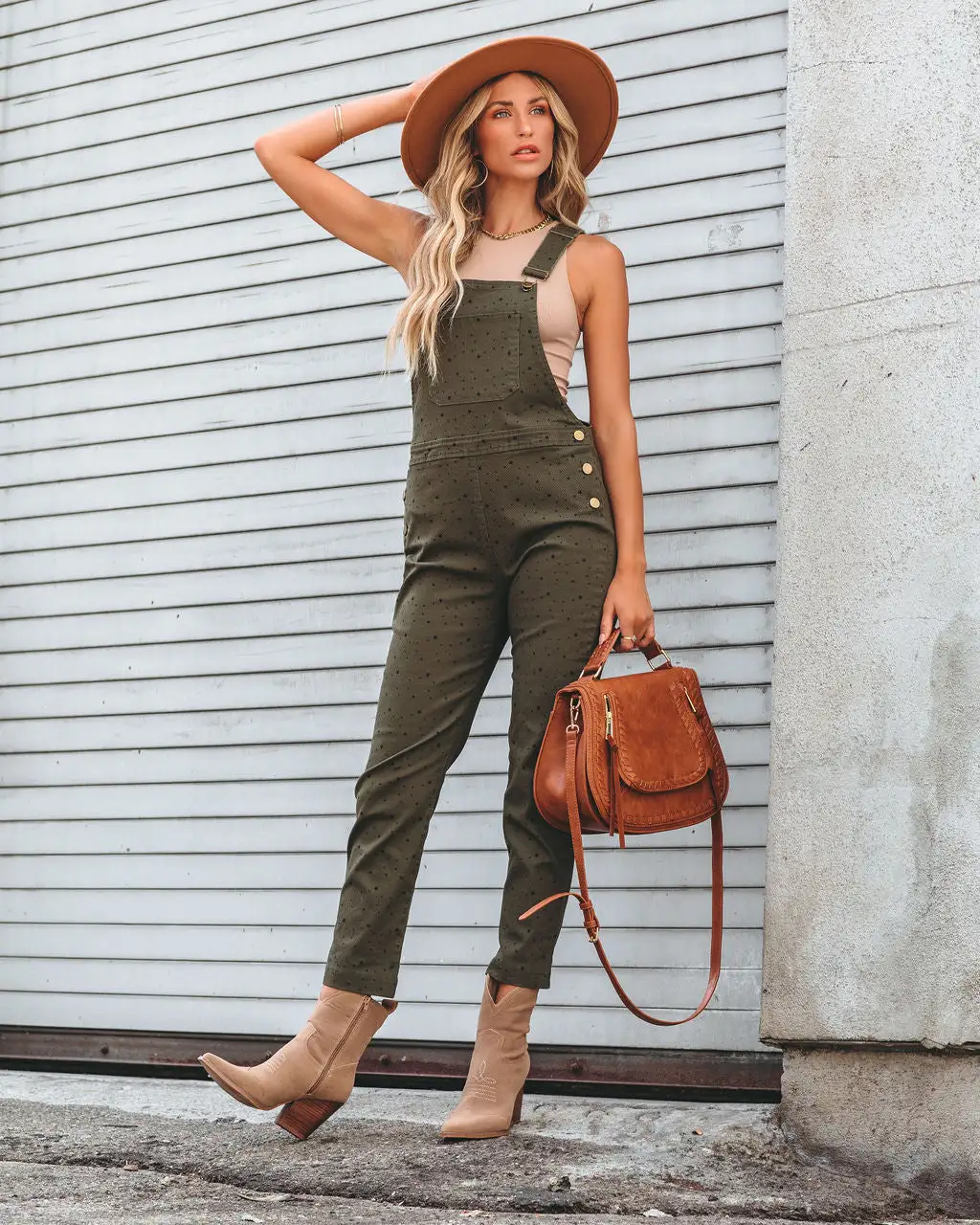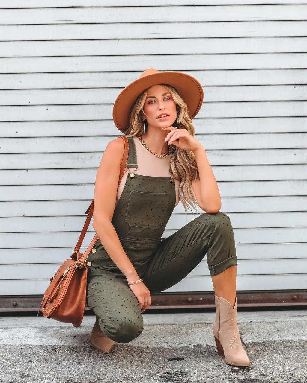 Trendy for Fall, the Stargazer Cotton Overalls in olive that feature a straight leg and a side button closure.