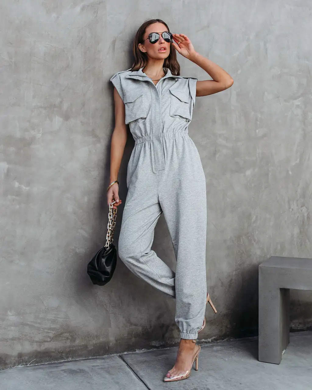 Trendy babes will love the Stronger Than Ever Pocketed Jumpsuit in heather grey that features an elastic waistband.