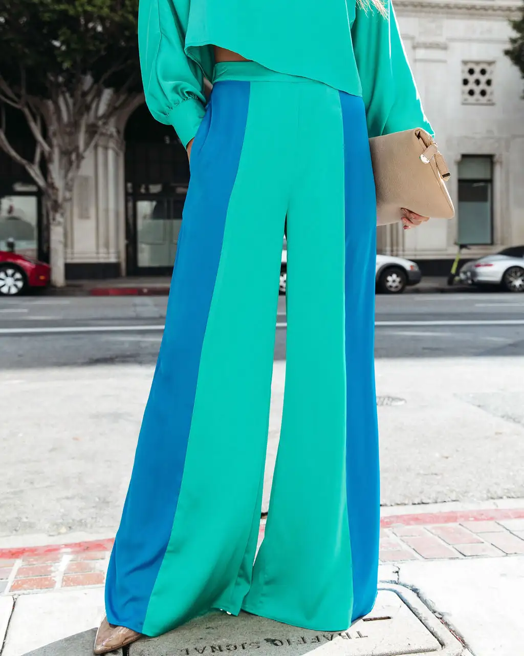 Stand out from the crowd in the Abbey Satin Pocketed Wide Leg Pants in turquoise and blue that features an elastic waistband.