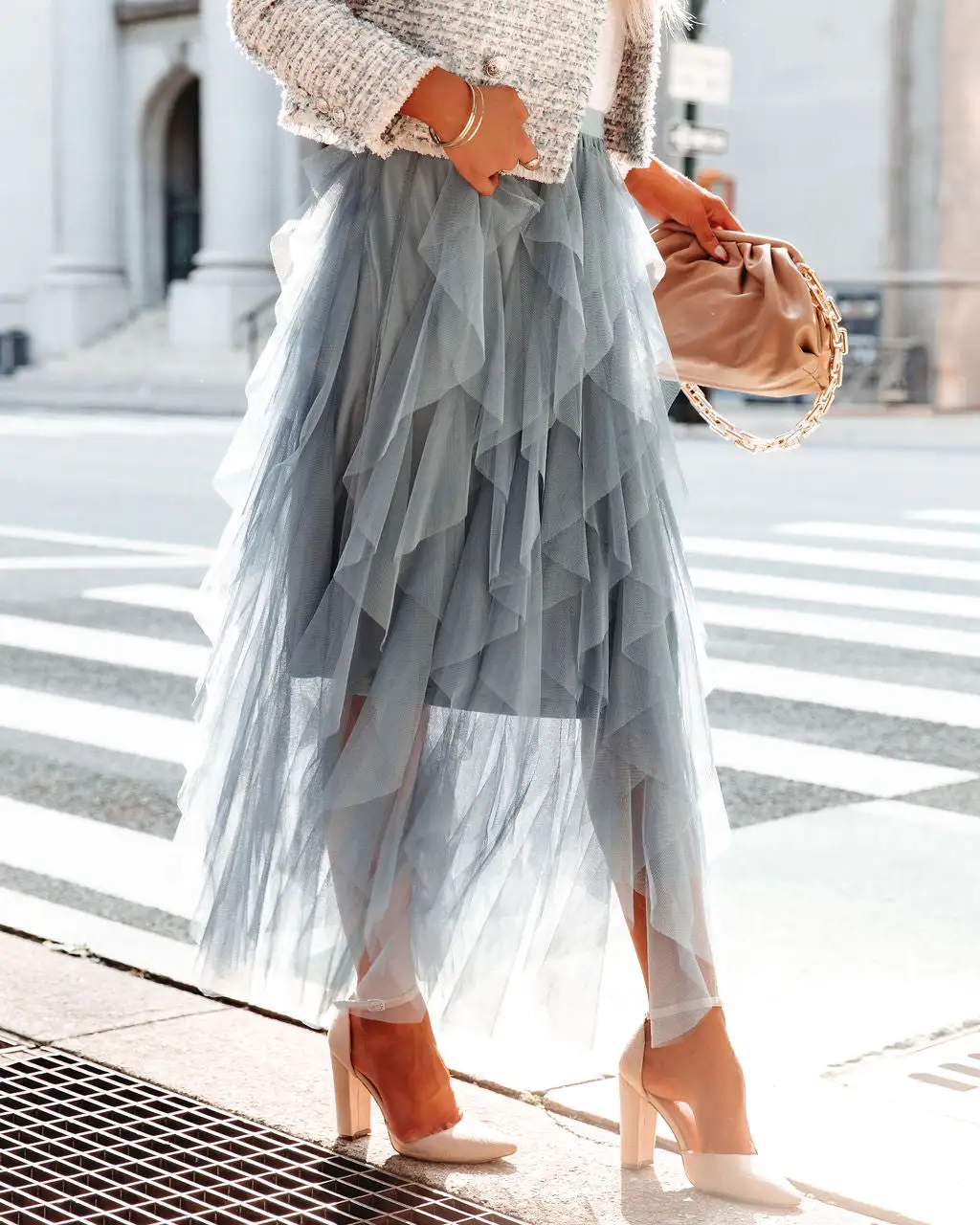 //Best Seller//New Color// Channel your inner Carrie Bradshaw in our Allegro Ruffle Tulle Midi Skirt! This blue grey tulle midi is crafted with an elastic waistband. Elevate this skirt with a blouse and strappy heels!