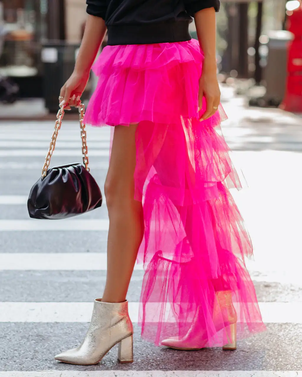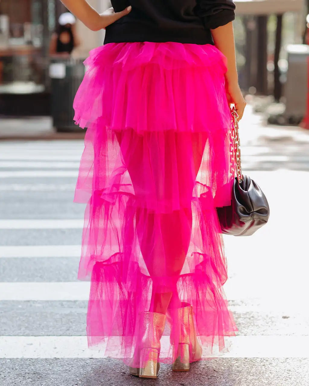 Channel your inner Carrie Bradshaw in our Liza High Low Tiered Tulle Maxi Skirt! This fuchsia colored skirt is crafted with an elastic waistband and a high low hemline. Contrast this femme piece with a graphic tee! Styled with the Perfect Hoop Earrings, St. Benedict Coin Necklace, Chic Crossbody Chain Pouch Bag, Excuse My French Embellished Cotton Pullover, and Veronica Metallic Pointed Bootie.