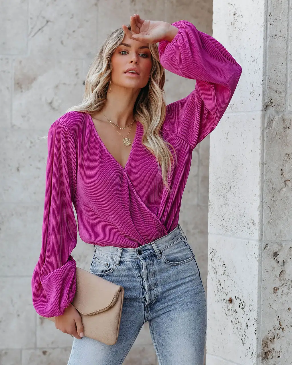 We’re bringing plisse back in the Nissa Plisse Drape Bodysuit in magenta with an elastic waistband and a romantic draped neckline.