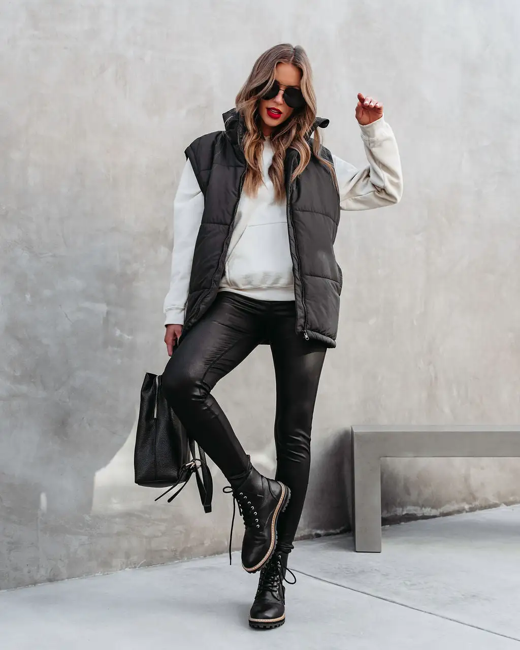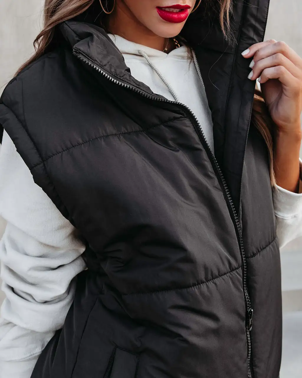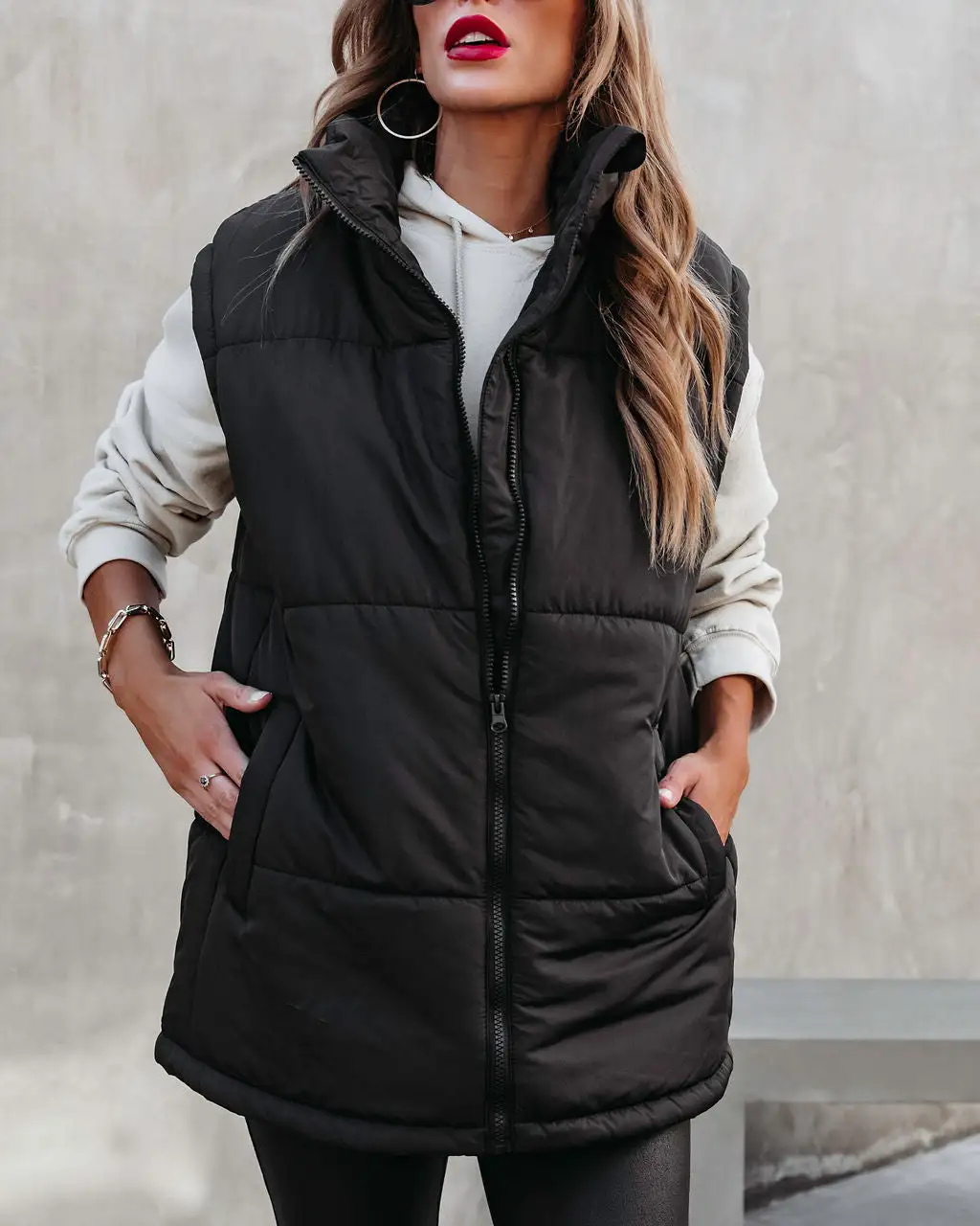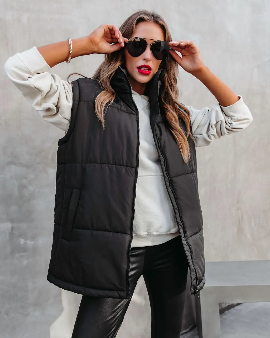 Add a layer of warmth in the Sutton Pocketed Puff Vest in black that features a front zipper closure.