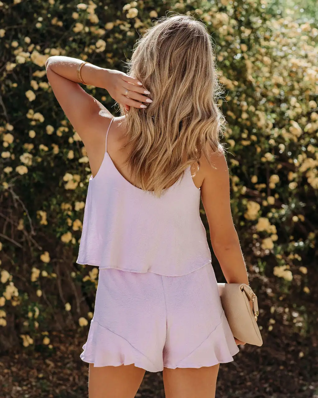 Effortless and breezy, the Sweet As Sugar Ruffle Romper in dusty lilac features a flowy top shelf and fixed straps.