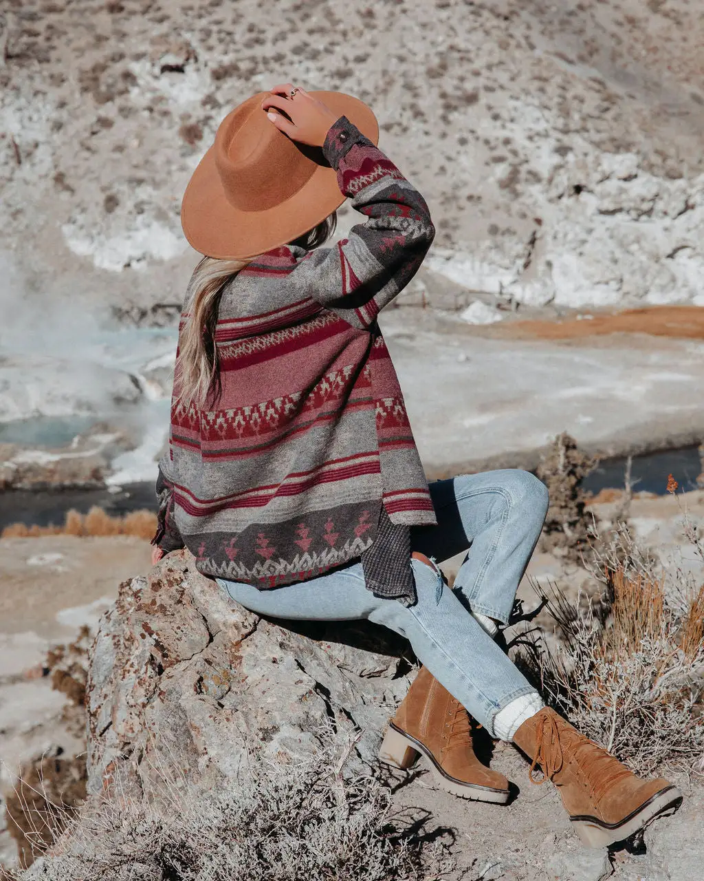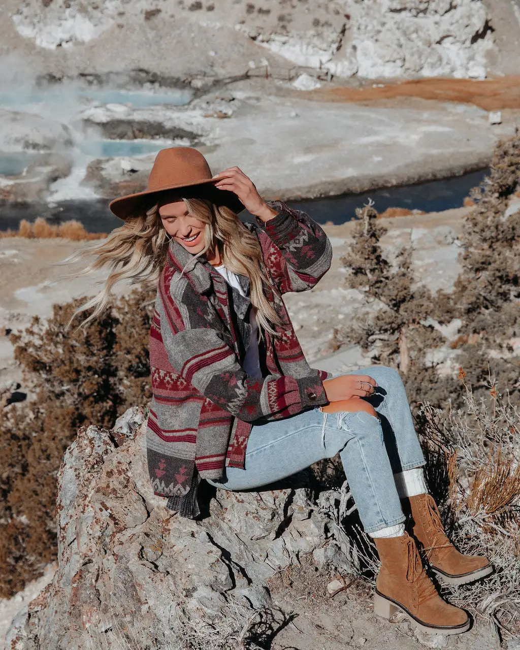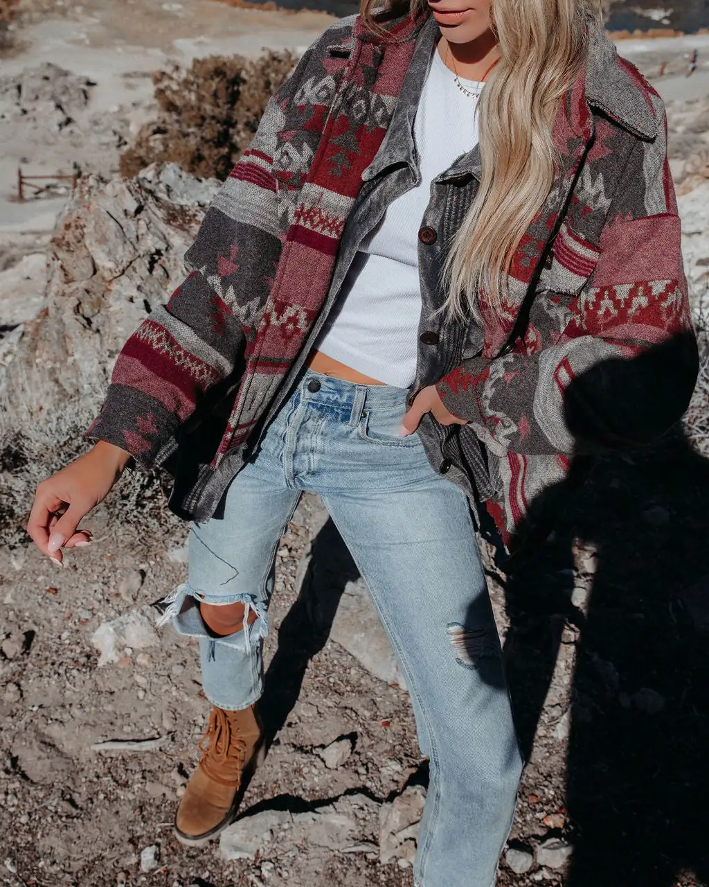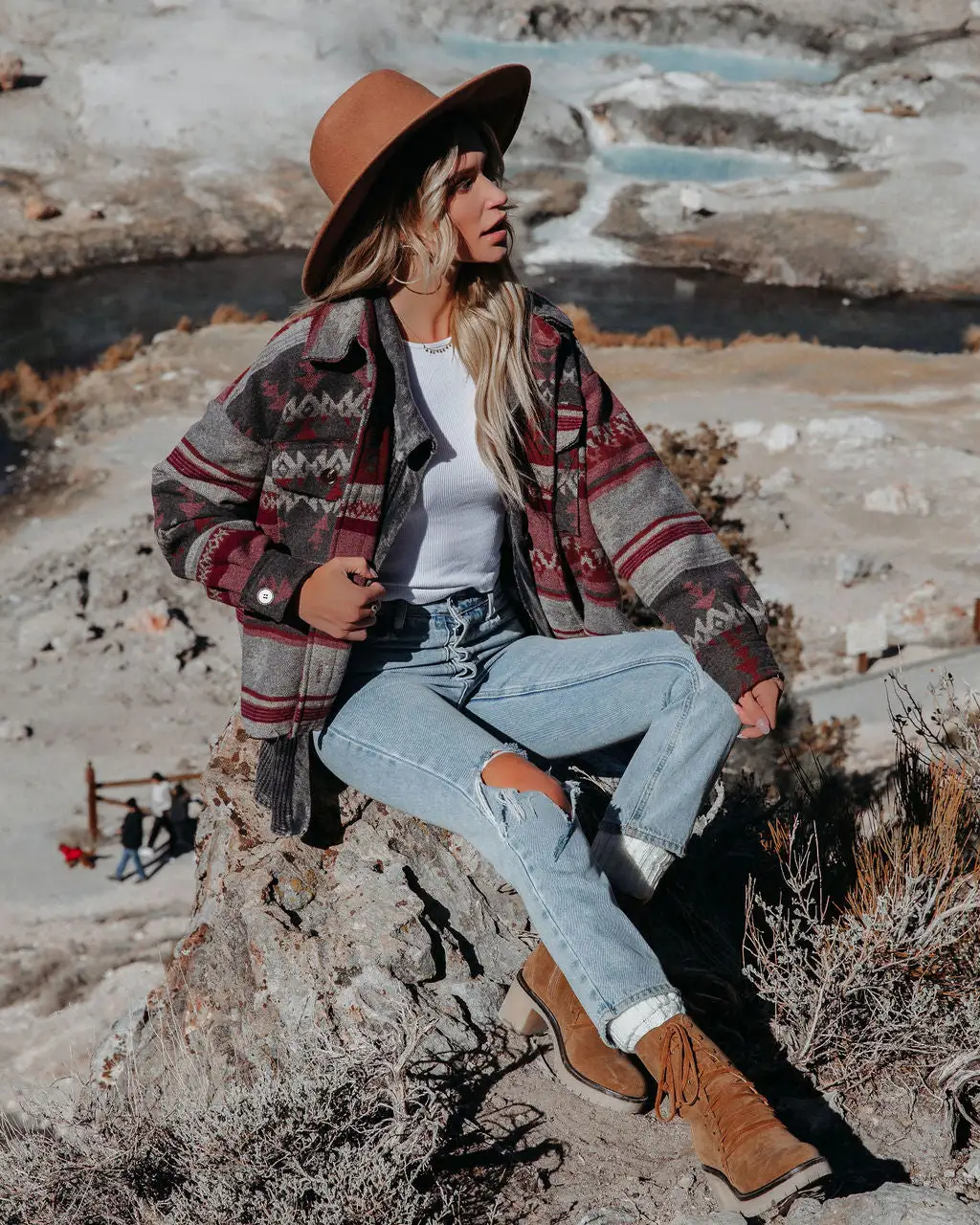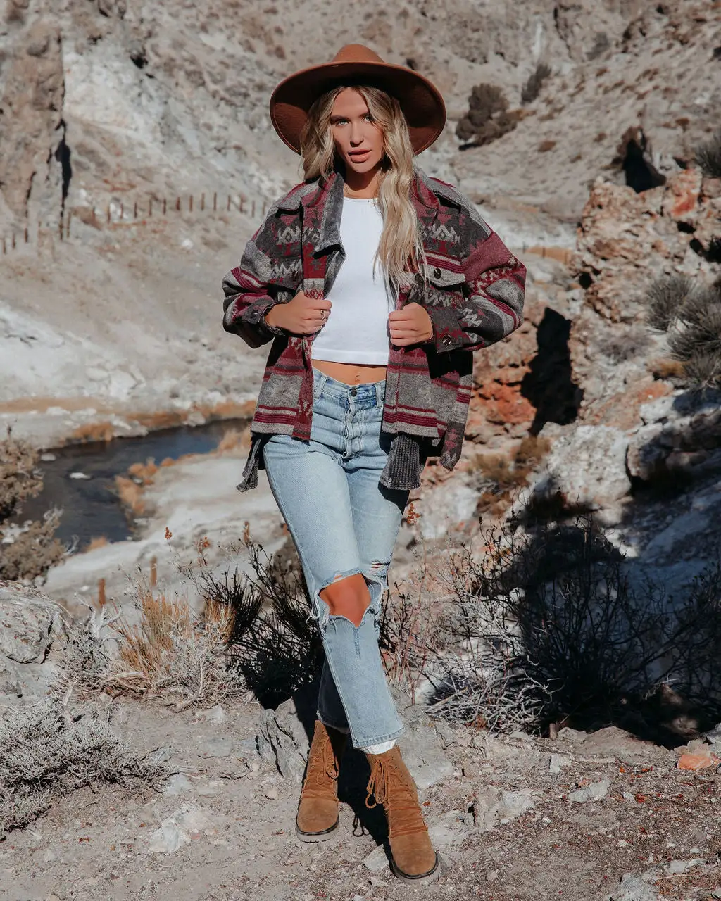 Head to the cabin our Sylvester Button Down Shacket! Charcoal, berry, wine, and grey hues detail this shacket. Designed with front button closures and front bust pockets. Finished with frayed edges. Styled with the El Dorado Hat, Chloe Mini Necklace, Kiki Knit Crop Top, Kason Distressed High Rise Denim, and Danny Lace Up Heeled Boot.
