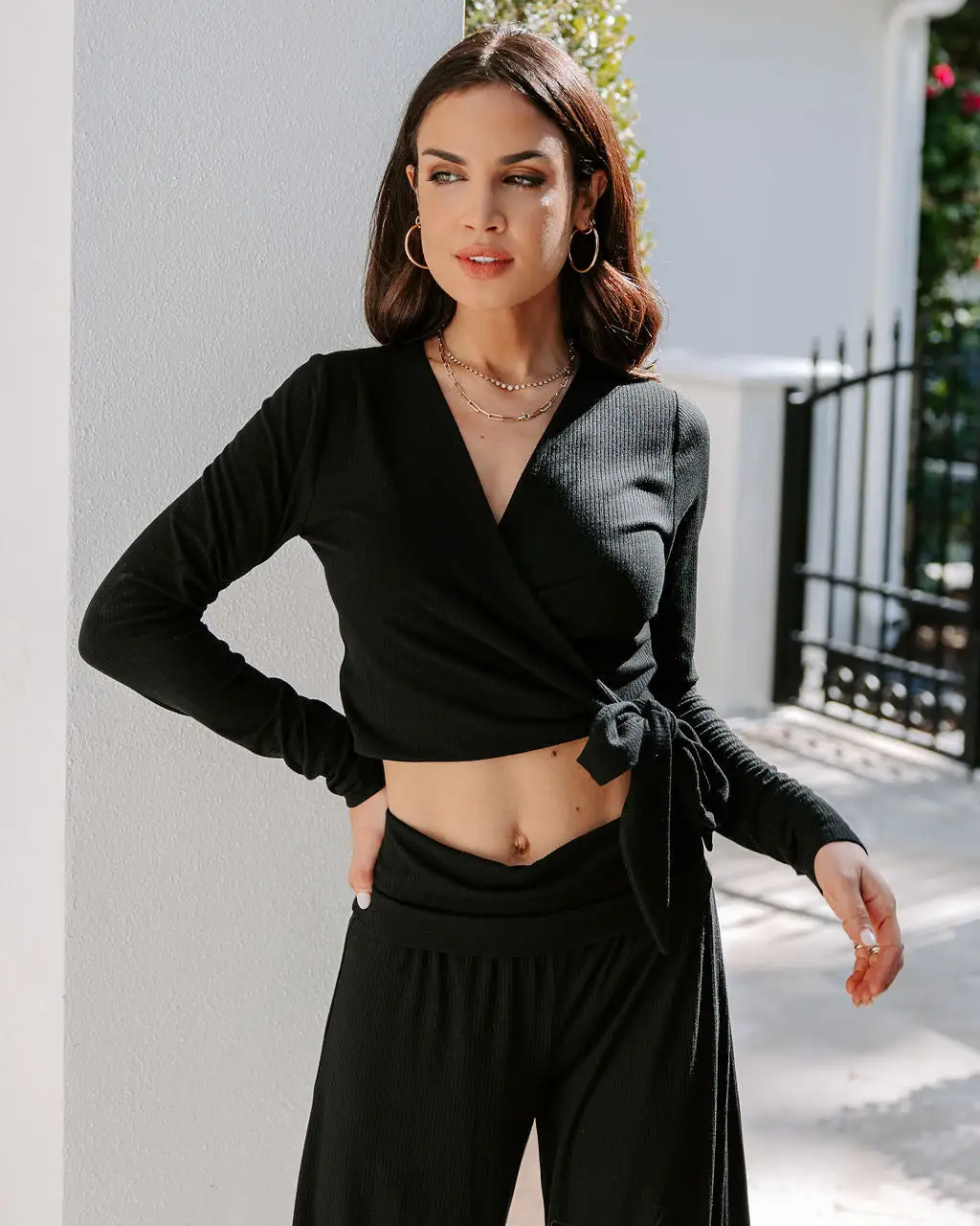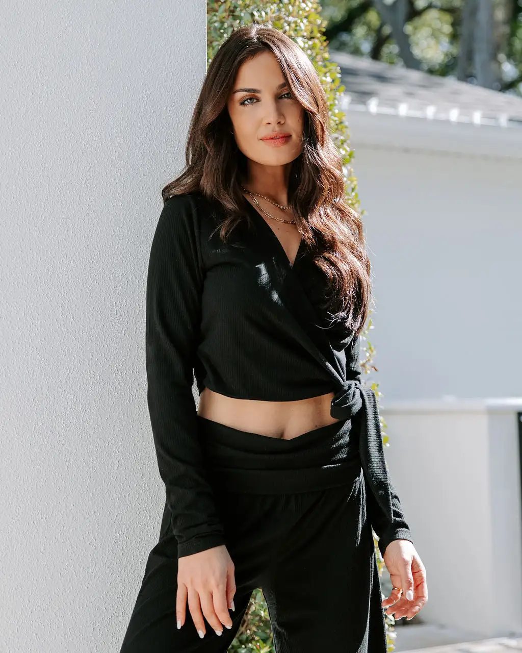 Look chic and comfy in the Take A Breather Ribbed Long Sleeve Wrap Top in black that features a draped neckline.