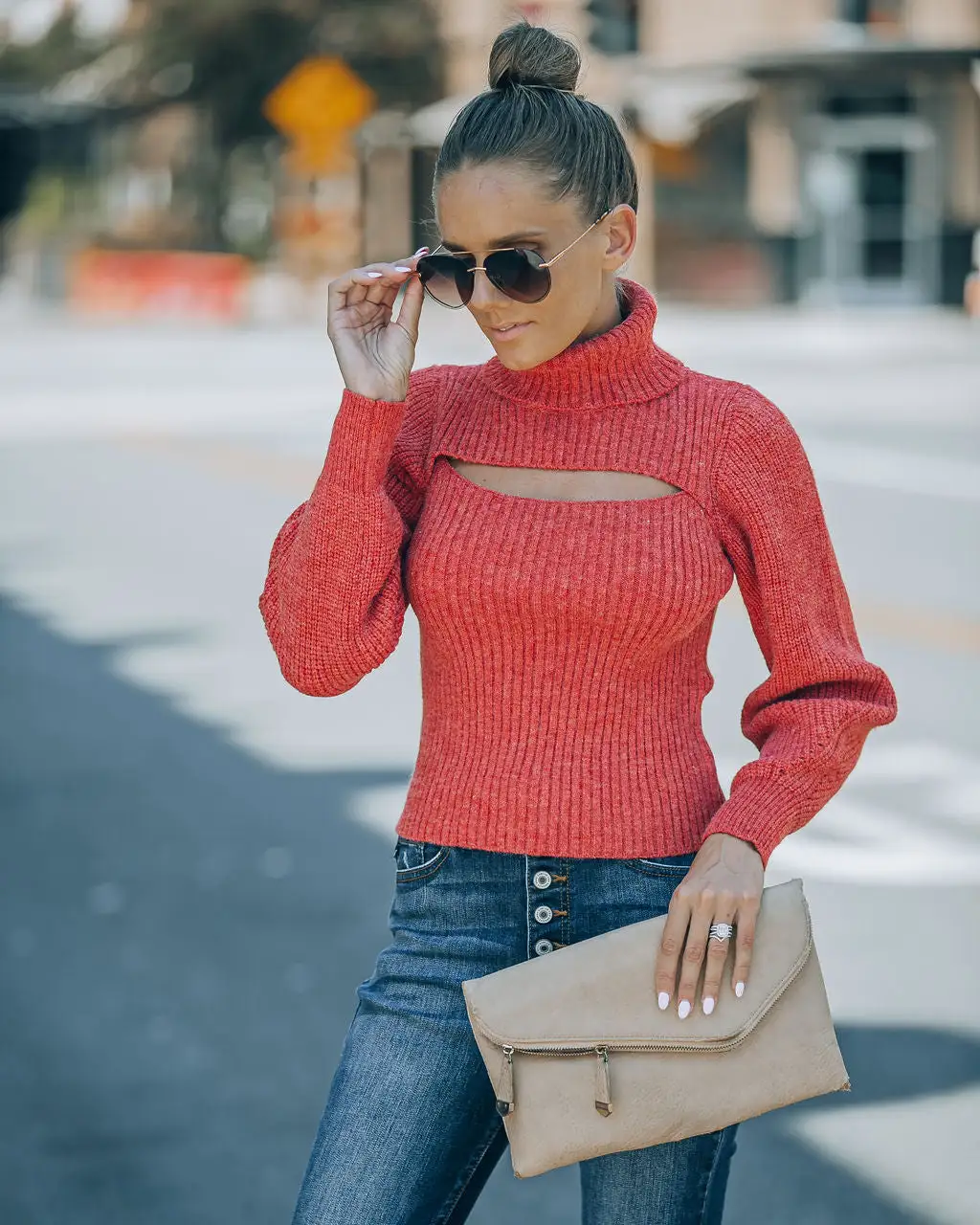Trendy and unique, the Taking Risks Knit Cutout Turtleneck Sweater in spice orange that features a chest cut out.