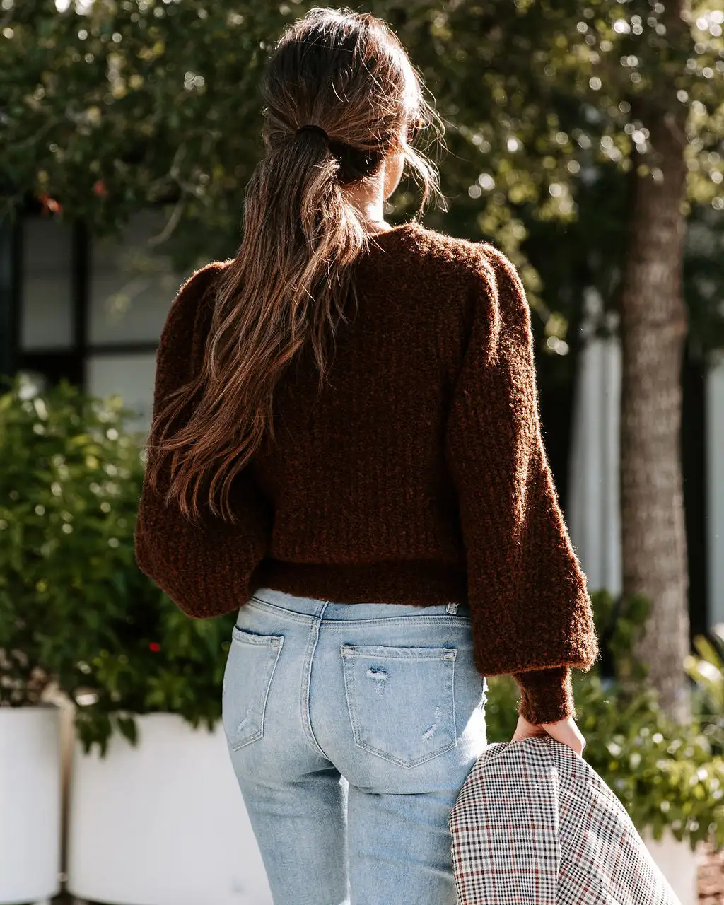 Look cute in the office in the Tana Balloon Sleeve Knit Sweater in chocolate that features balloon sleeves.