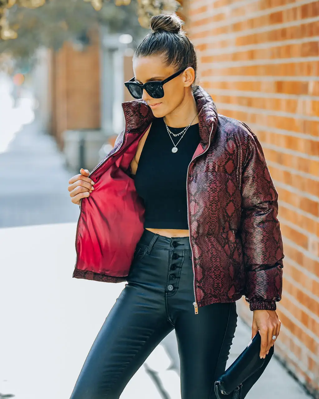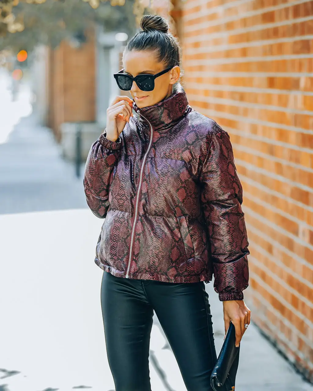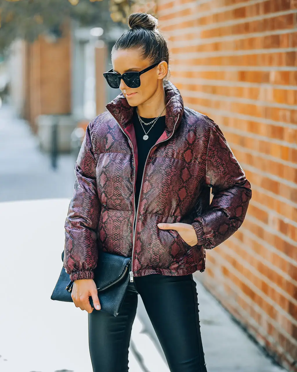 Keep it sleek and chic in our Giada Pocketed Python Puffer Jacket! This burgundy embossed jacket features side pockets and an inner adjustable tie closure. Secured with a front zipper closure. Styled with the Carson Black Frame Dark Smoke Polarized Sunglasses, Chloe Mini Necklace, Compass Coin Necklace, Simple Bangle Bracelet, Stella Crossbody Envelope Zip Clutch, Kiki Knit Crop Top, Soho High Rise Coated Skinny, and Jocelyn Heeled Bootie.