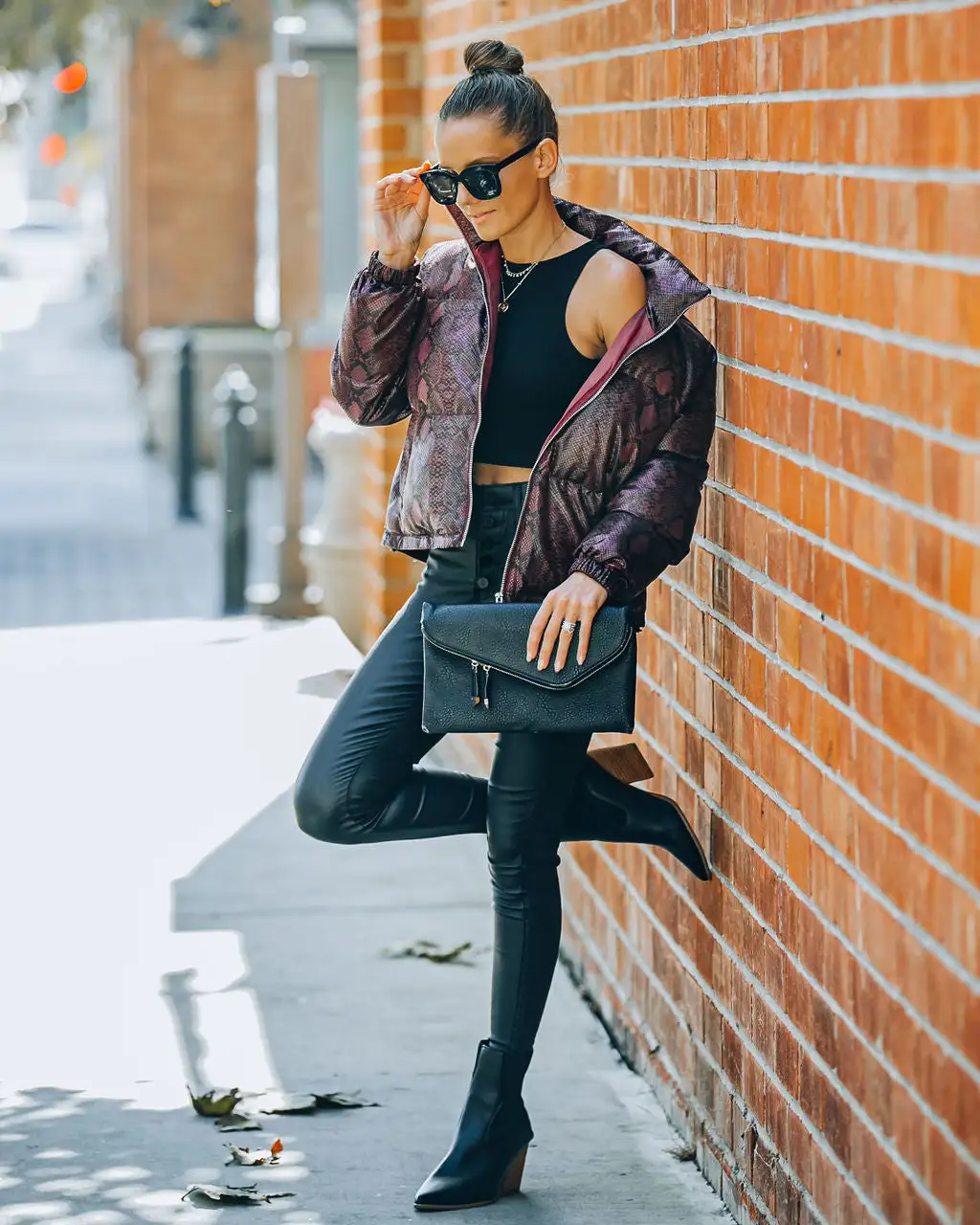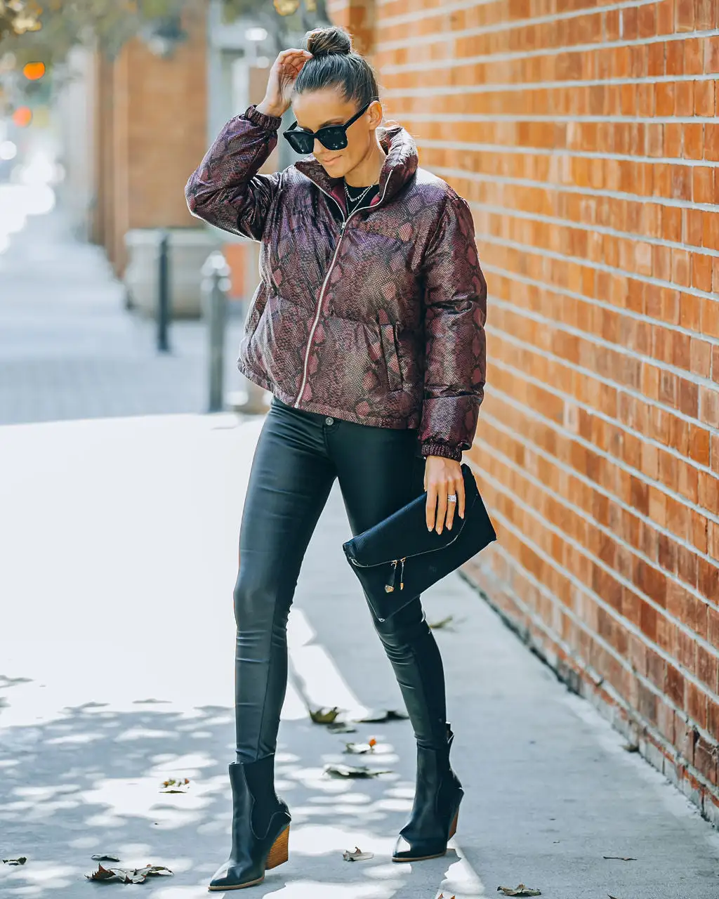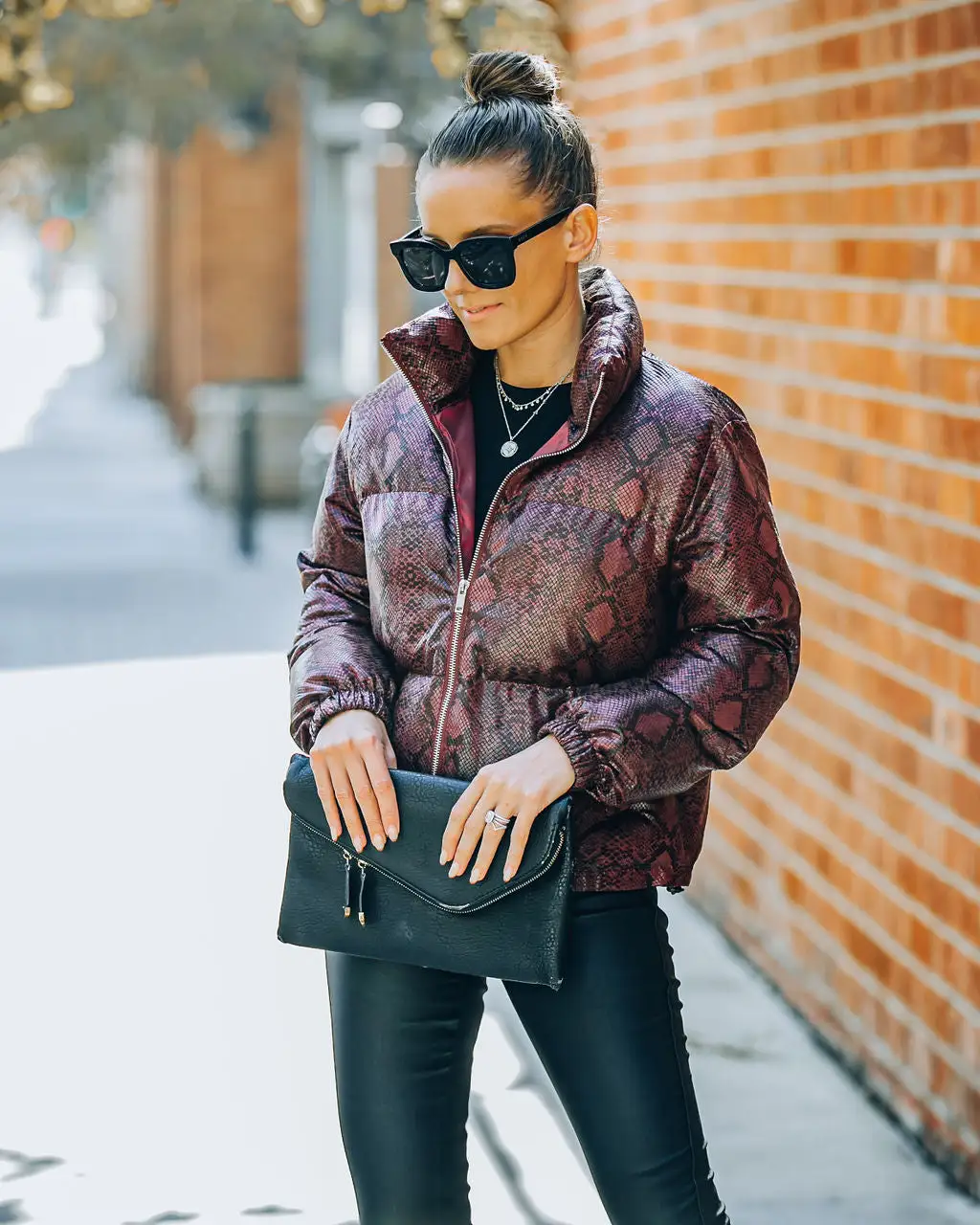 Keep it sleek and chic in our Giada Pocketed Python Puffer Jacket! This burgundy embossed jacket features side pockets and an inner adjustable tie closure. Secured with a front zipper closure. Styled with the Carson Black Frame Dark Smoke Polarized Sunglasses, Chloe Mini Necklace, Compass Coin Necklace, Simple Bangle Bracelet, Stella Crossbody Envelope Zip Clutch, Kiki Knit Crop Top, Soho High Rise Coated Skinny, and Jocelyn Heeled Bootie.