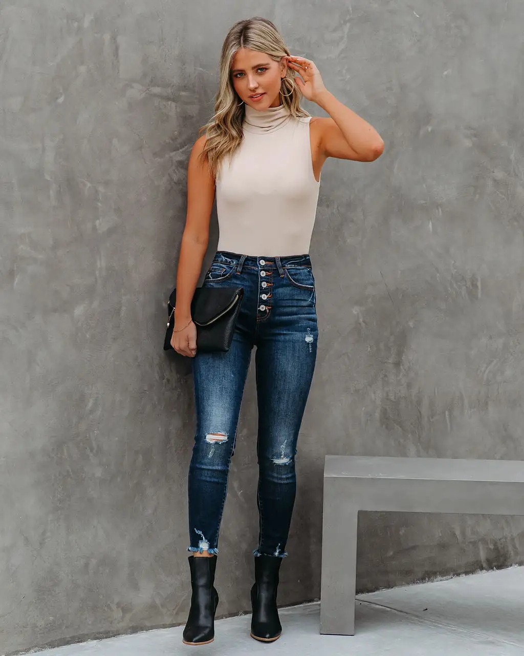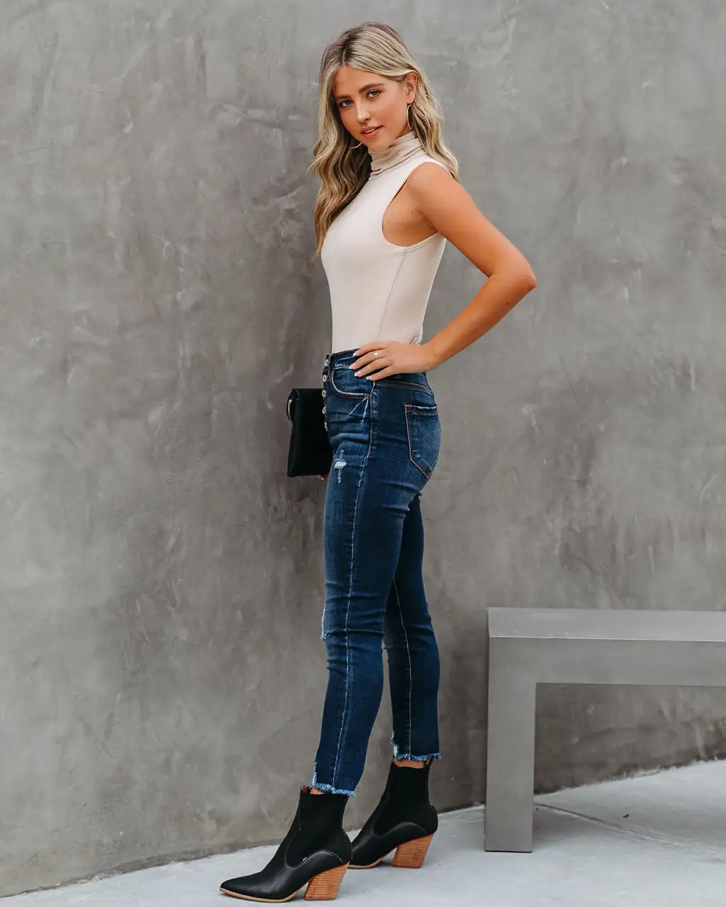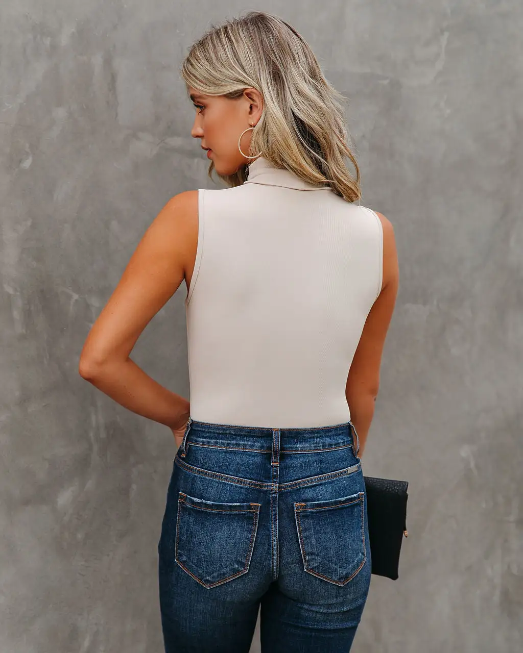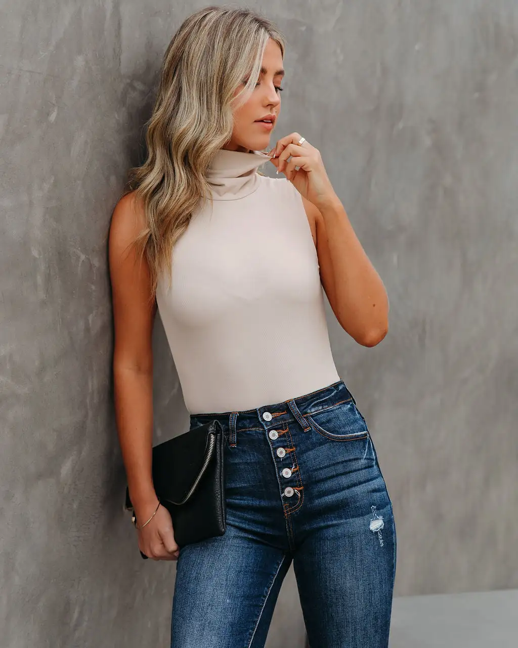 It’s finally turtleneck SZN! Our Kenzi Seamless Turtleneck Bodysuit is your new layering go-to. This cream seamless piece was crafted in a micro ribbed knit fabrication. Secured with snap button closures. Styled with the Perfect Hoop Earrings, Simple Bangle Bracelet, Stella Crossbody Envelope Zip Clutch, Tilley Frayed Ankle High Waisted Skinny, and Jocelyn Heeled Bootie.