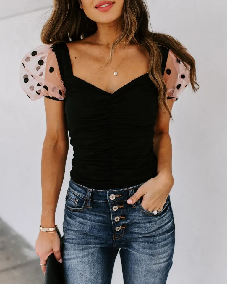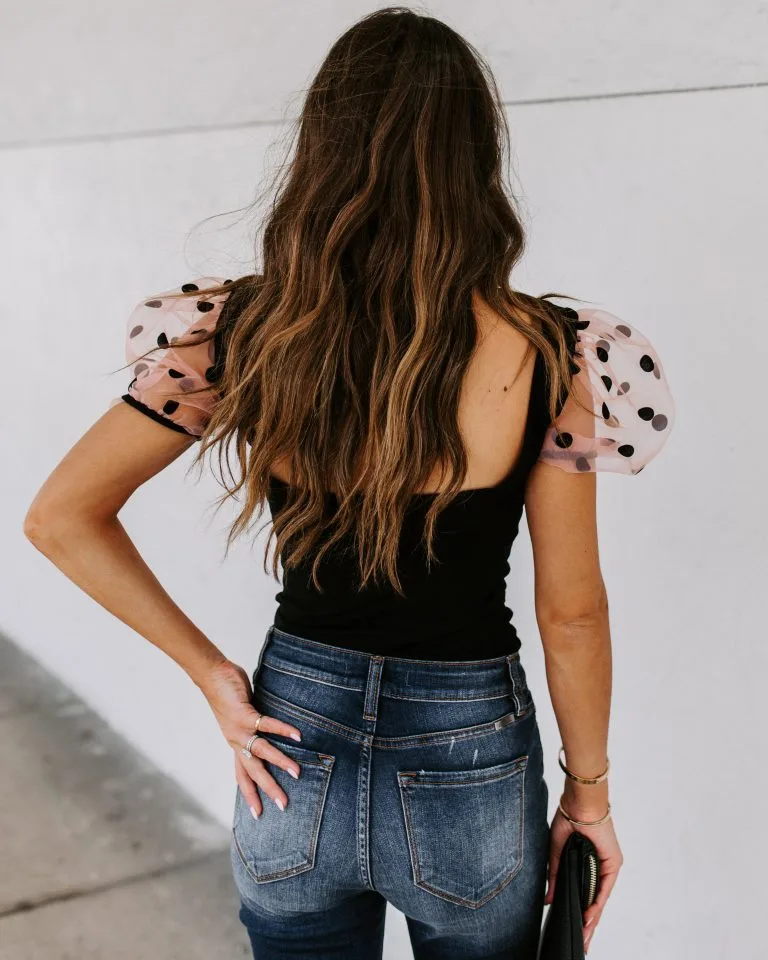 //Best Seller// The Minnie Ruched Puff Sleeve Bodysuit is subtly sexy featuring pretty pink organza sleeves with black velvet polka dots.