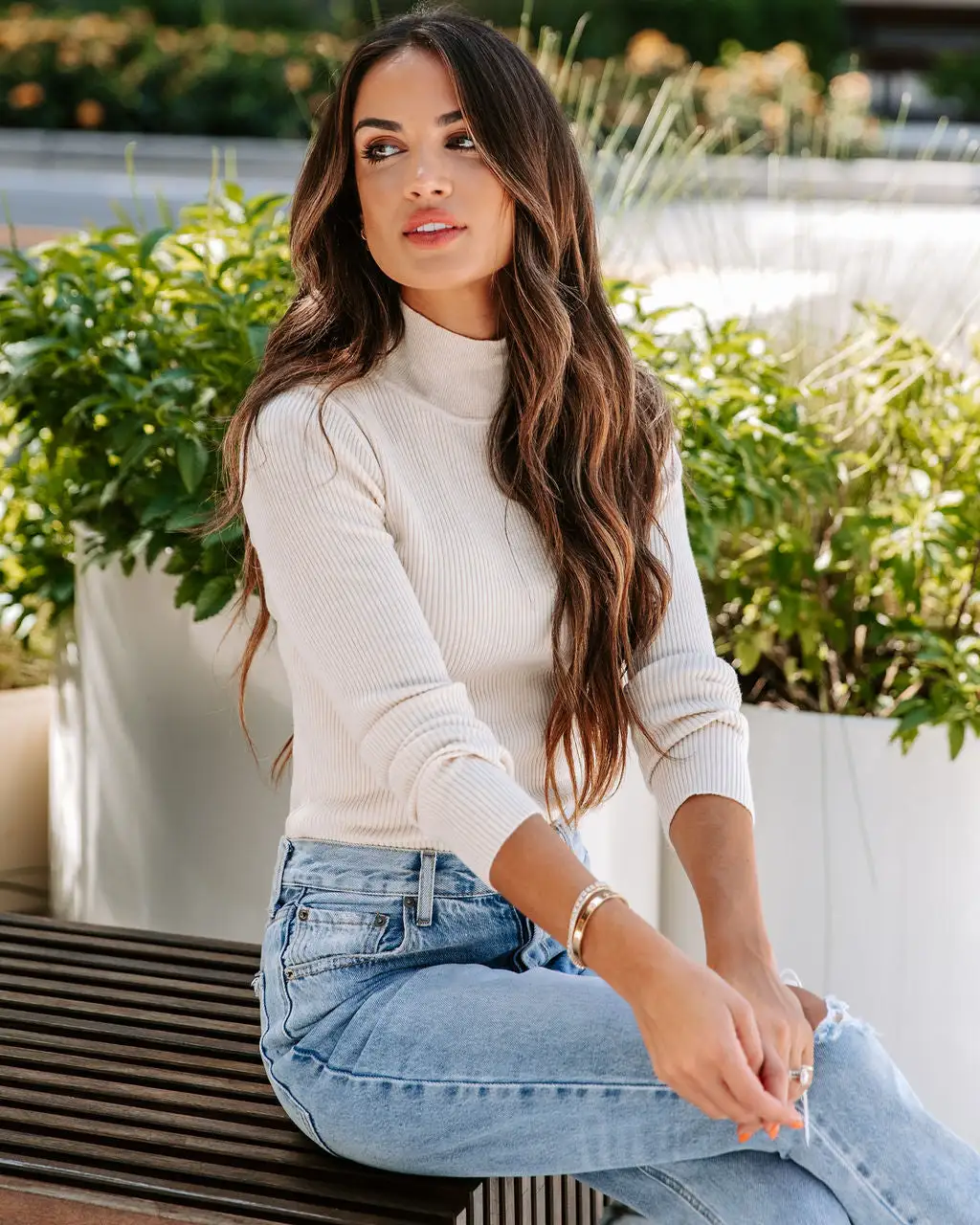 A Fall essential, the Tell Me About It Ribbed Mock Neck Long Sleeve Top in oatmeal features a high neckline.