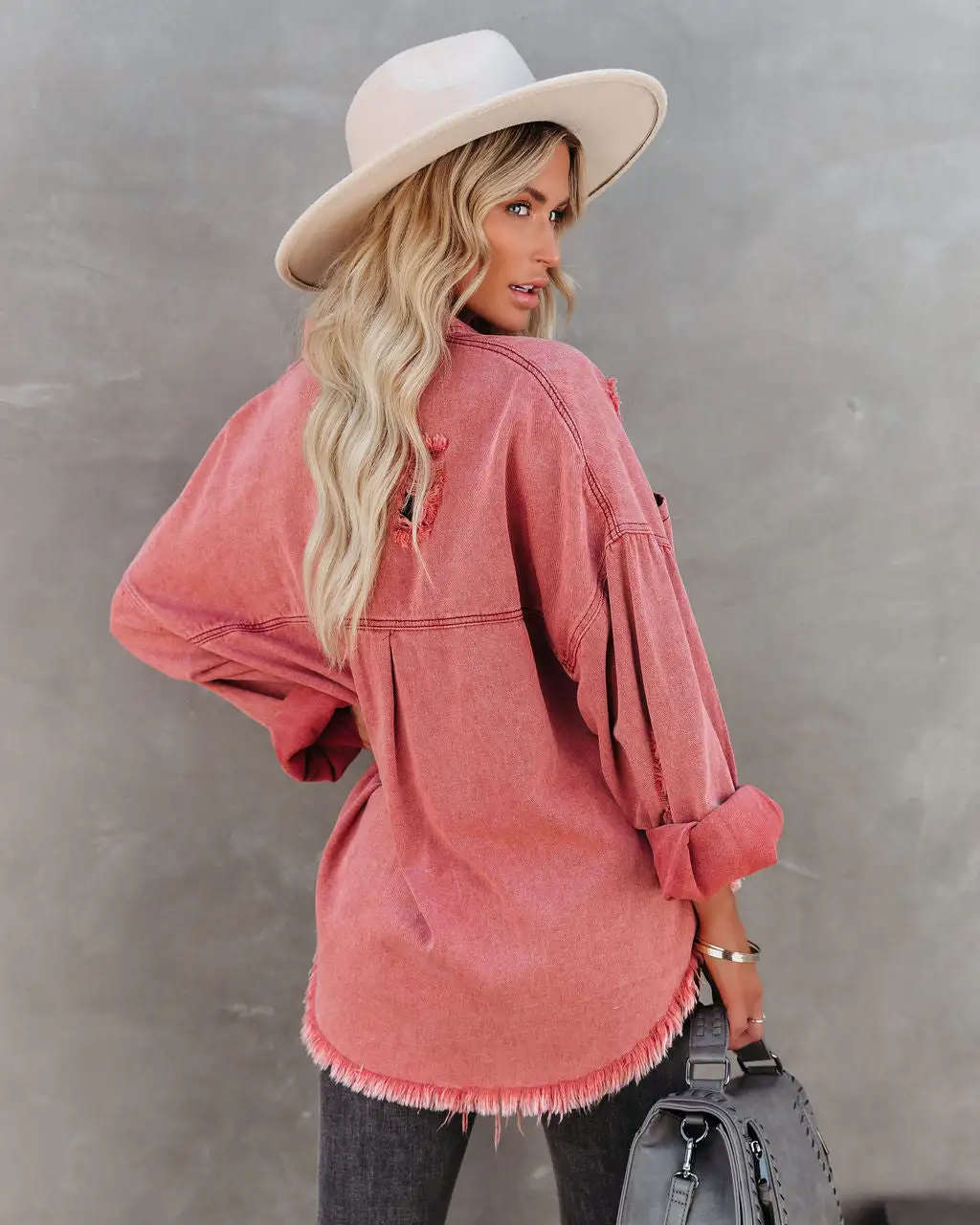 //VICI Exclusive// Upgrade your outerwear in our Thinking Out Loud Cotton Distressed Denim Jacket! This powder brick piece is designed with a collar and bust pockets. Finished with front button closures. Styled with the El Dorado Hat, Chloe Mini Necklace, Compass Coin Necklace, Calm Seamless Scoop Cami, Simple Bangle Bracelet, Uptown Faux Suede Heeled Bootie, Mariden High Rise Distressed Skinny, Uptown Faux Suede Heeled Bootie, and Highland Bag.