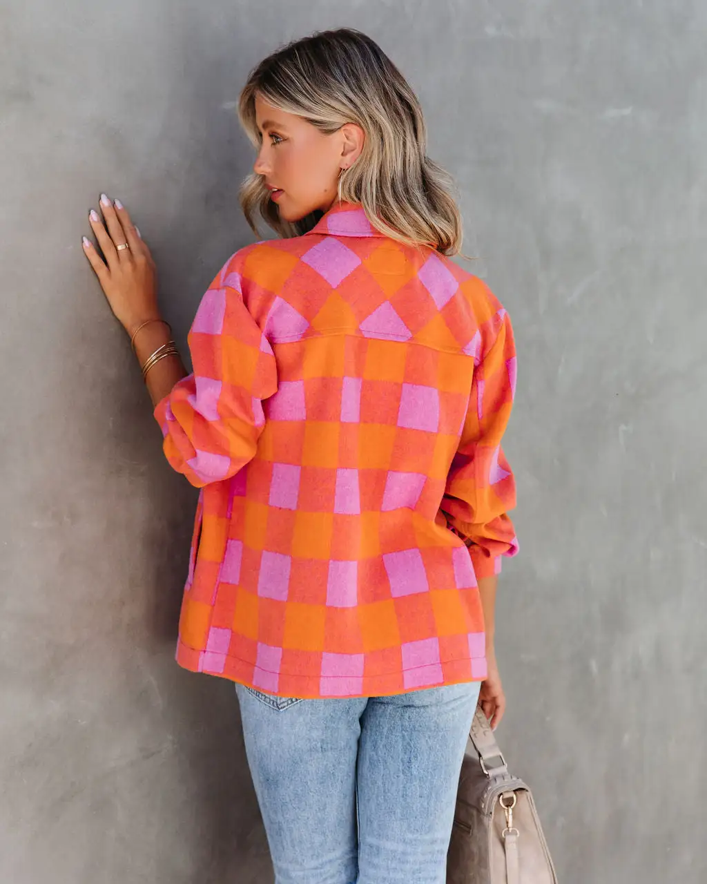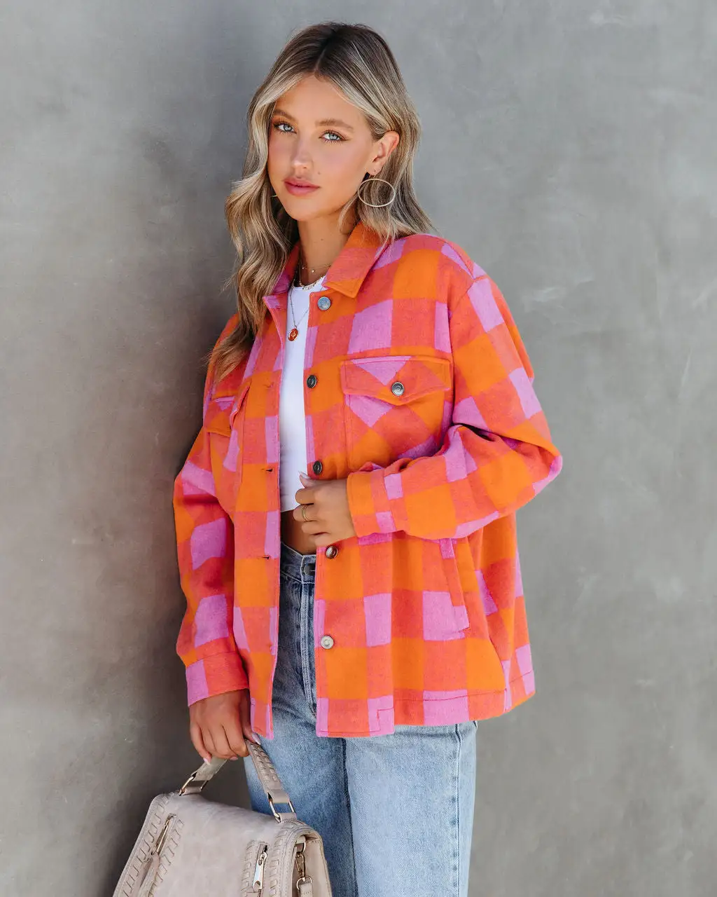 Have your most colorful Fall ever in the Timber Checkered Pocketed Shacket in orange and pink that features front button closures.