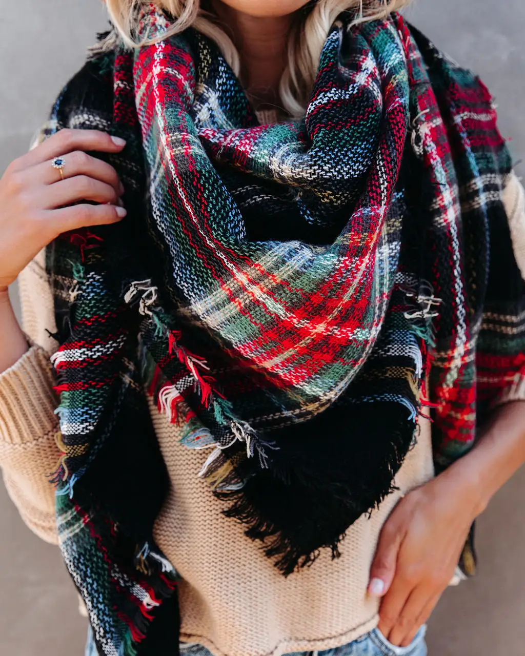 Shades of black, red, yellow, green, blue, white and charcoal are featured on our Total Eclipse Plaid Blanket Scarf. This beautiful soft, plaid knit fabrication with subtle fringe edges is the perfect addition to any fall wardrobe.