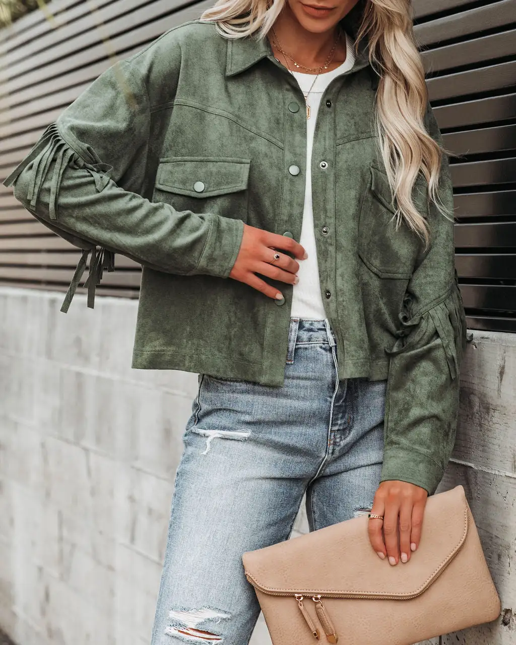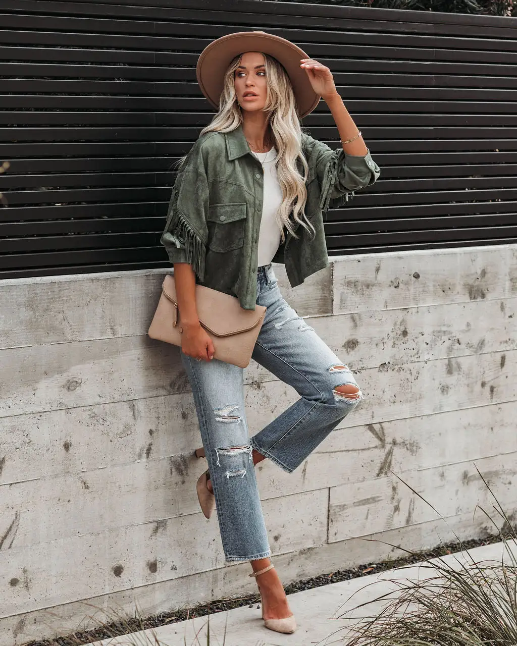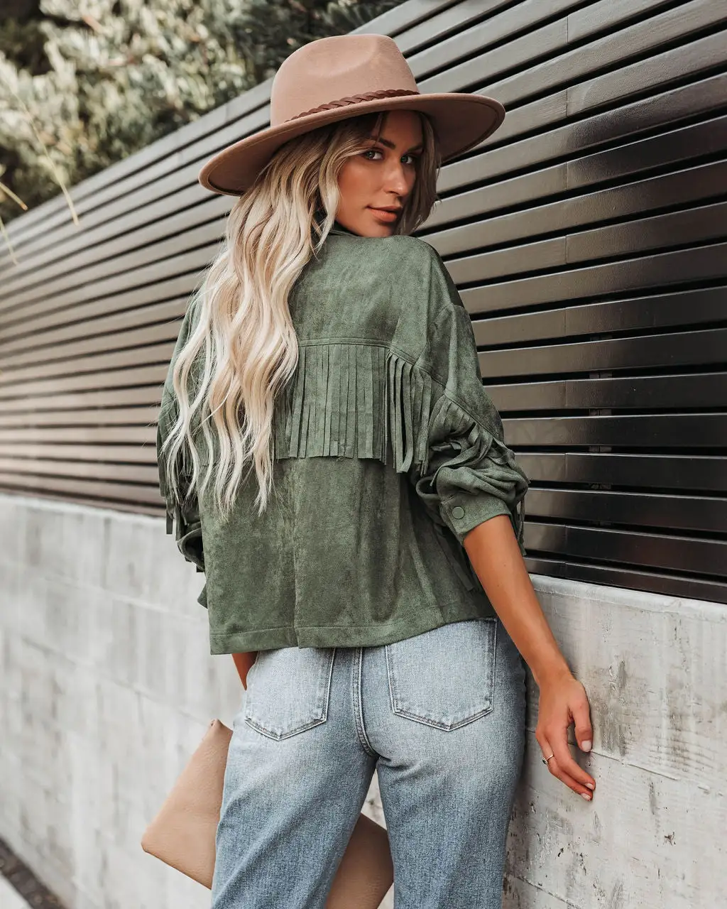 //VICI Exclusive// Upgrade your festival style in the Tuck Fringe Faux Suede Jacket in dusty teal with a dramatic fringe trimming.
