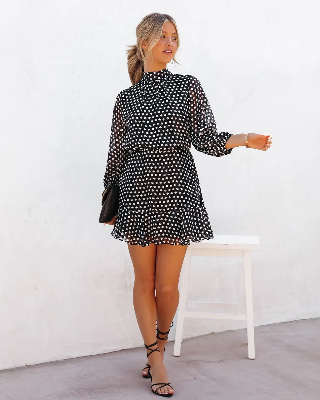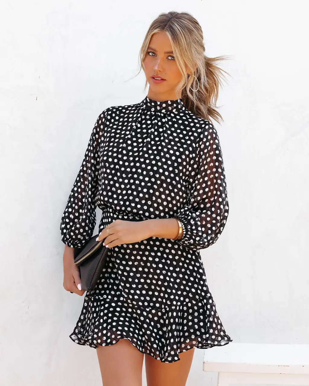 //VICI Exclusive// Be spotted in the Leyla Polka Dot Shimmer Dress in black that’s detailed with off-white polka dots and gold shimmer threads.