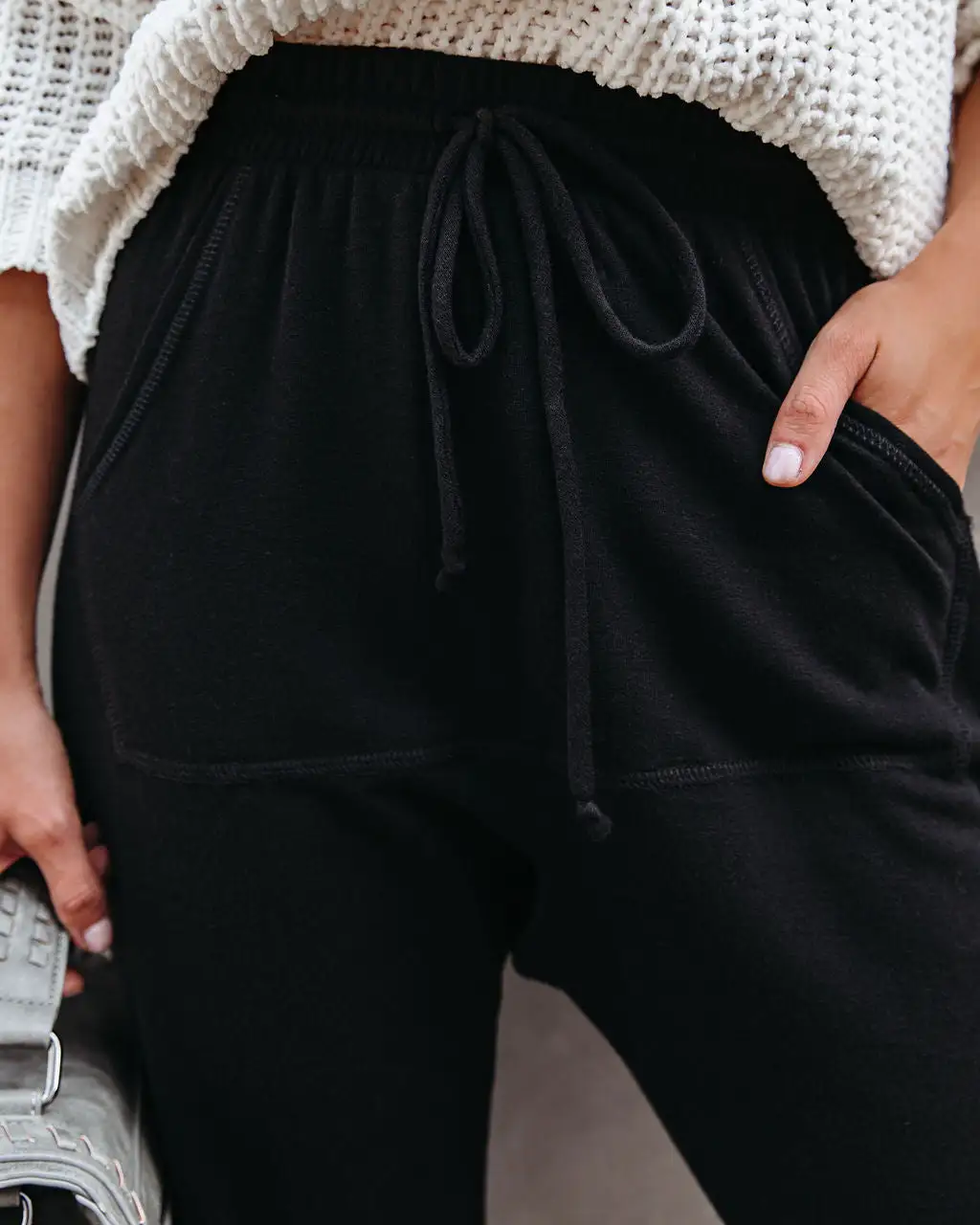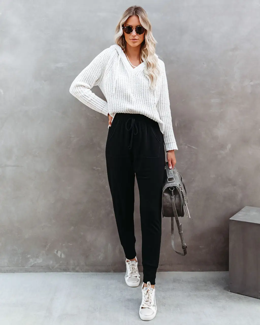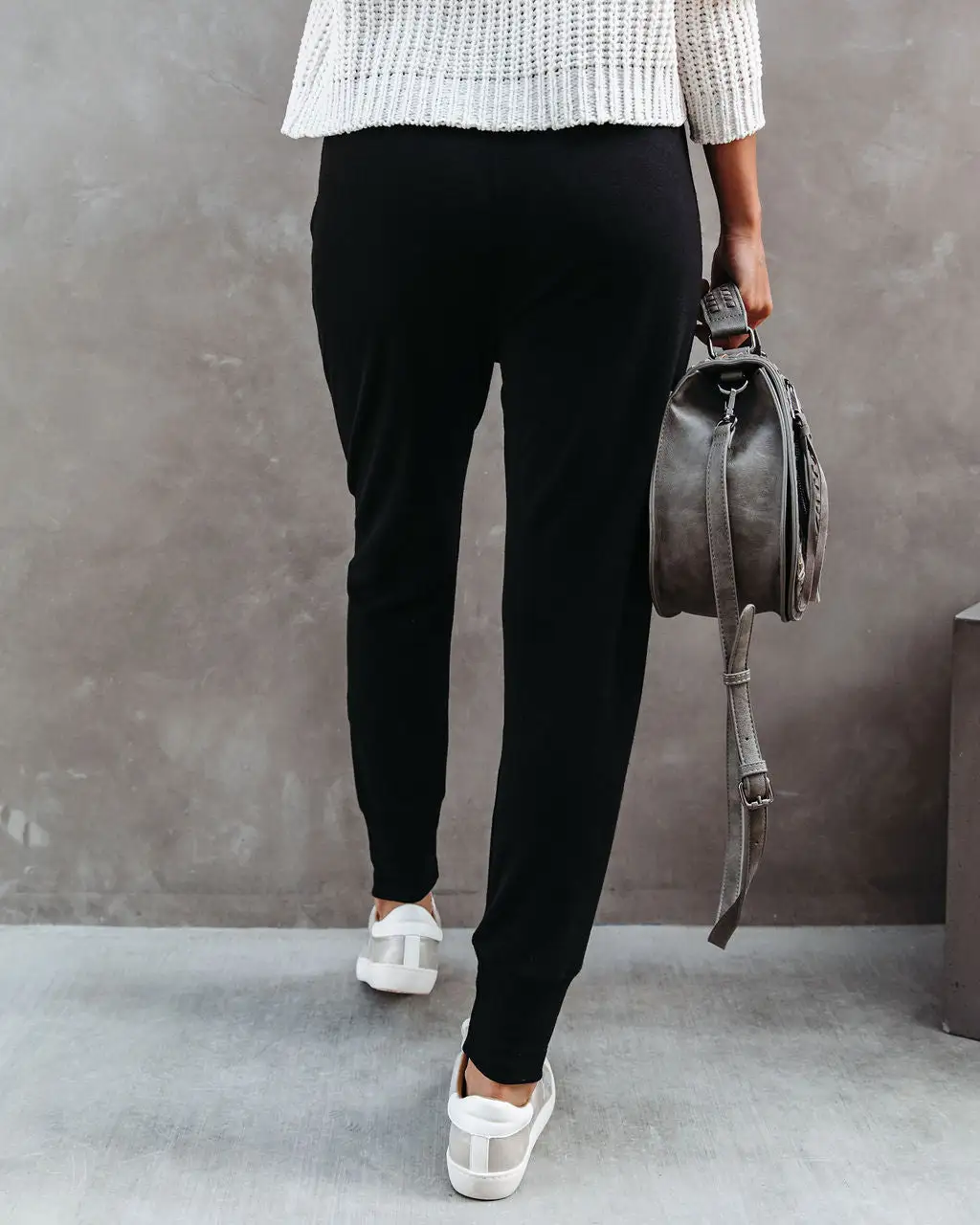//VICI Exclusive// Our Steadfast Pocketed Knit Joggers are a luxe leisure style in a stretchy black knit. Fit with an elastic drawstring waist, tapered legs and side pockets. Elevate your look with a lace cami, heels and a chic clutch!