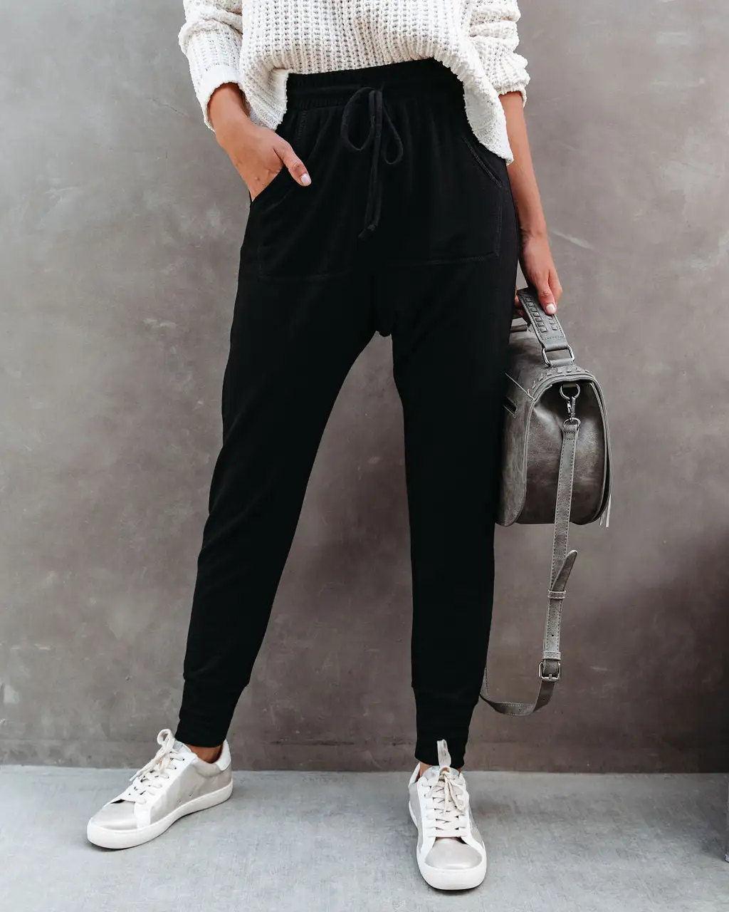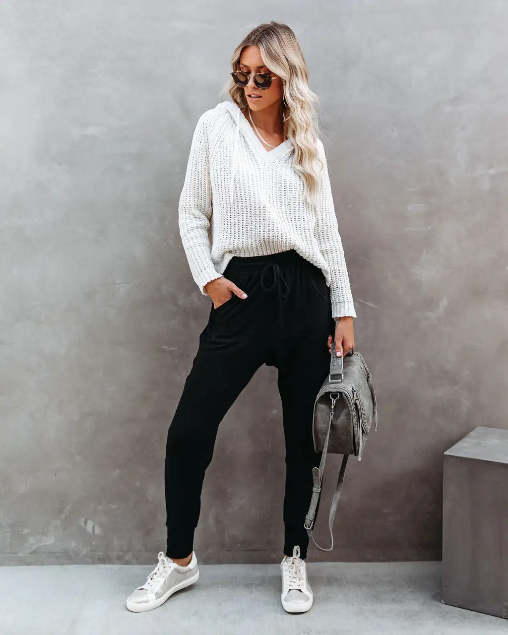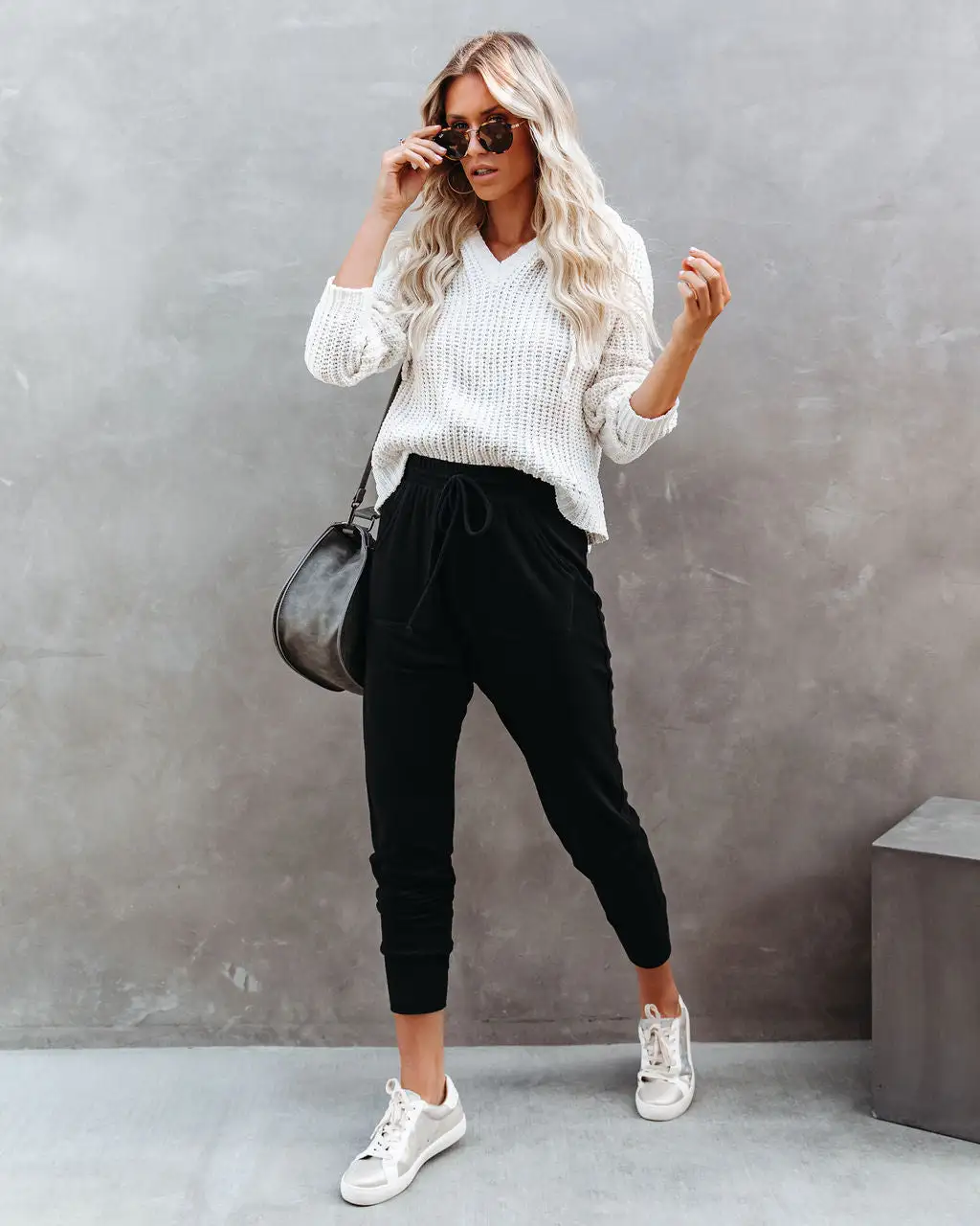 //VICI Exclusive// Our Steadfast Pocketed Knit Joggers are a luxe leisure style in a stretchy black knit. Fit with an elastic drawstring waist, tapered legs and side pockets. Elevate your look with a lace cami, heels and a chic clutch!
