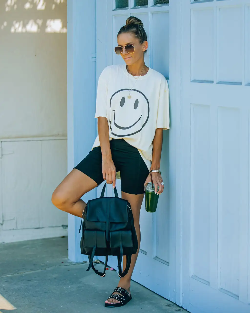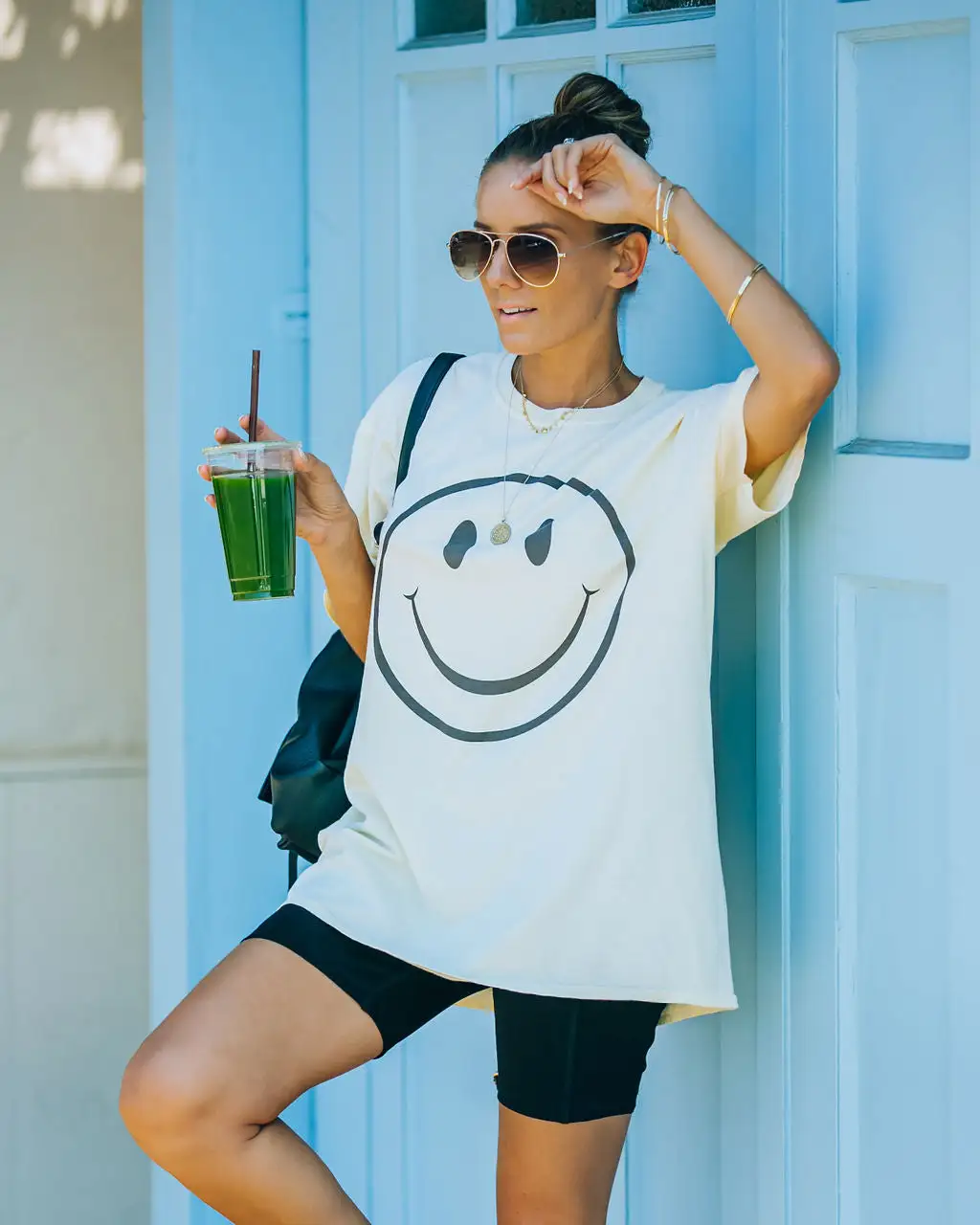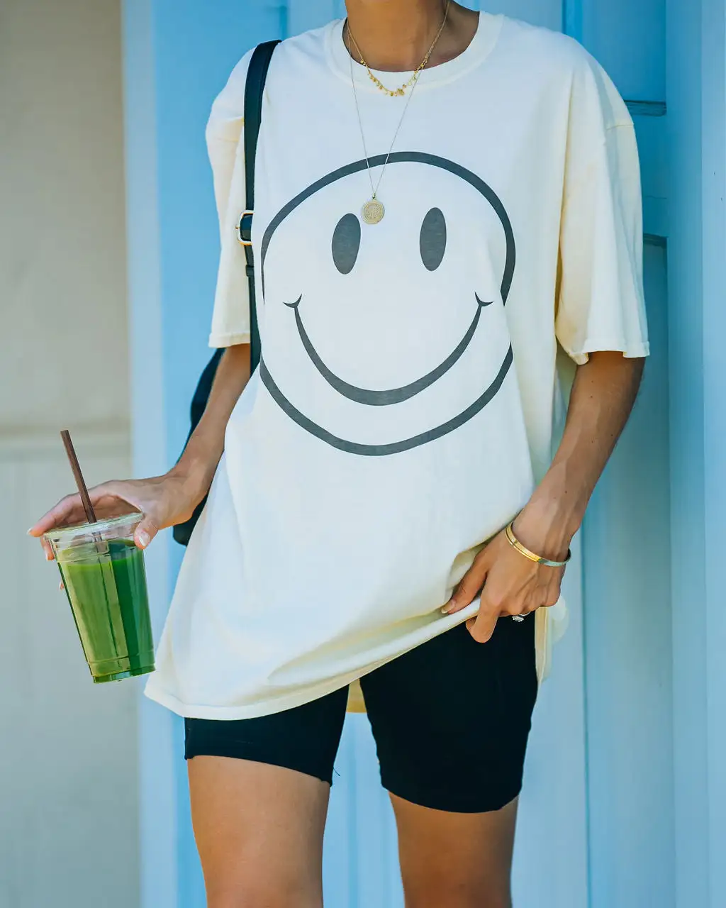 //Best Seller// Spread cheer in our Warm Smile Cotton Oversized Tee in pale yellow with a front black smiley face graphic and a crew neckline.
