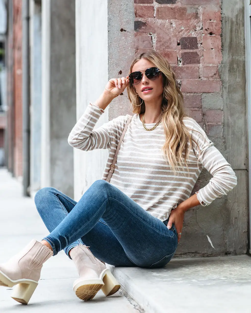 Simple and striped, the Well Loved Striped Knit Top in beige features a wide neckline and a rounded hemline.