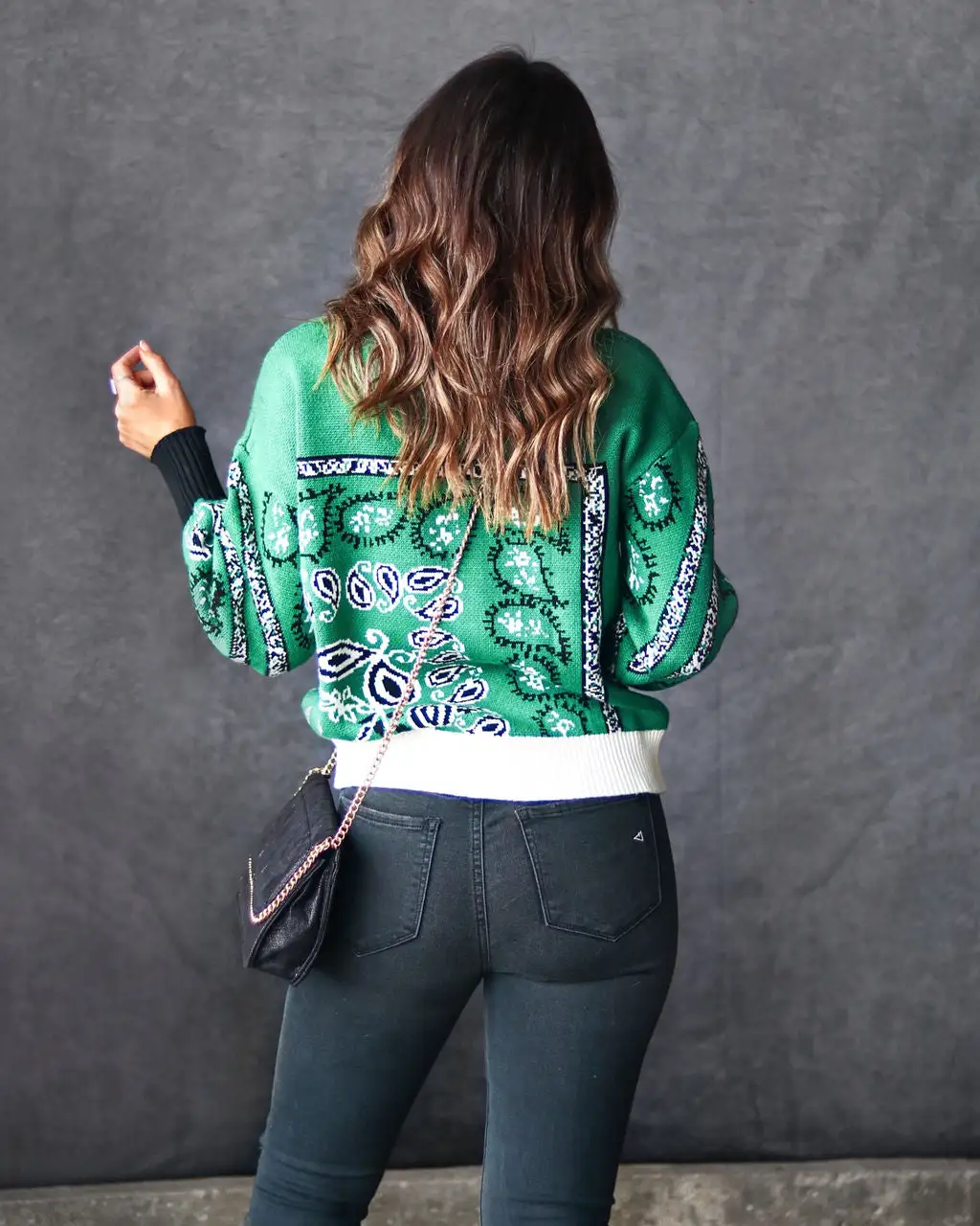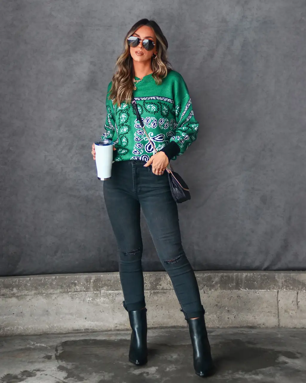 Western meets comfy in the Westley Knit Bandana Sweater in hunter green that features a high neckline.