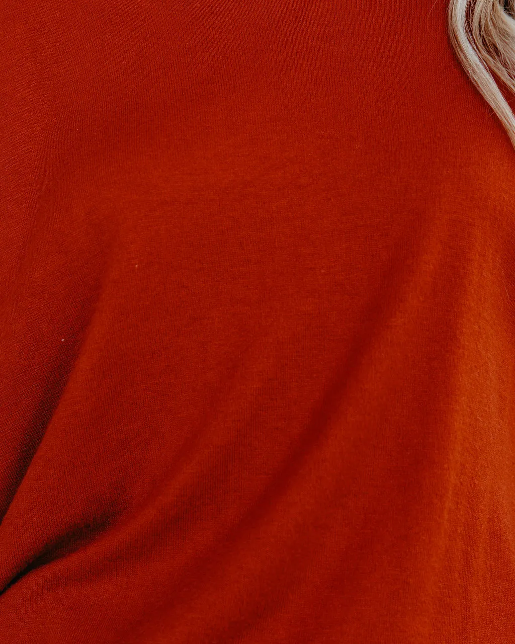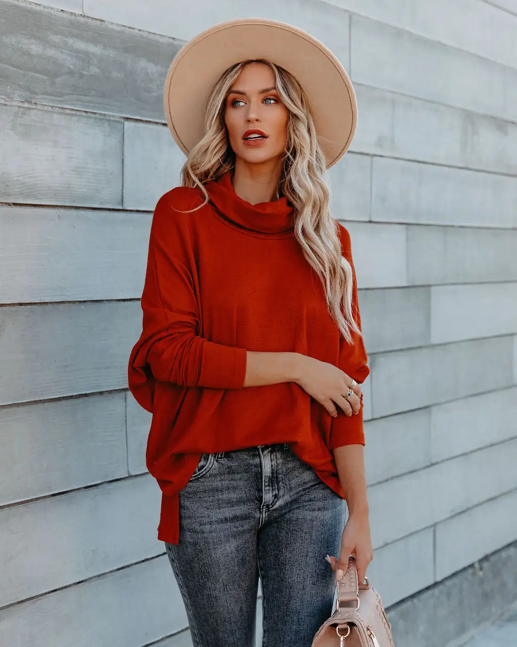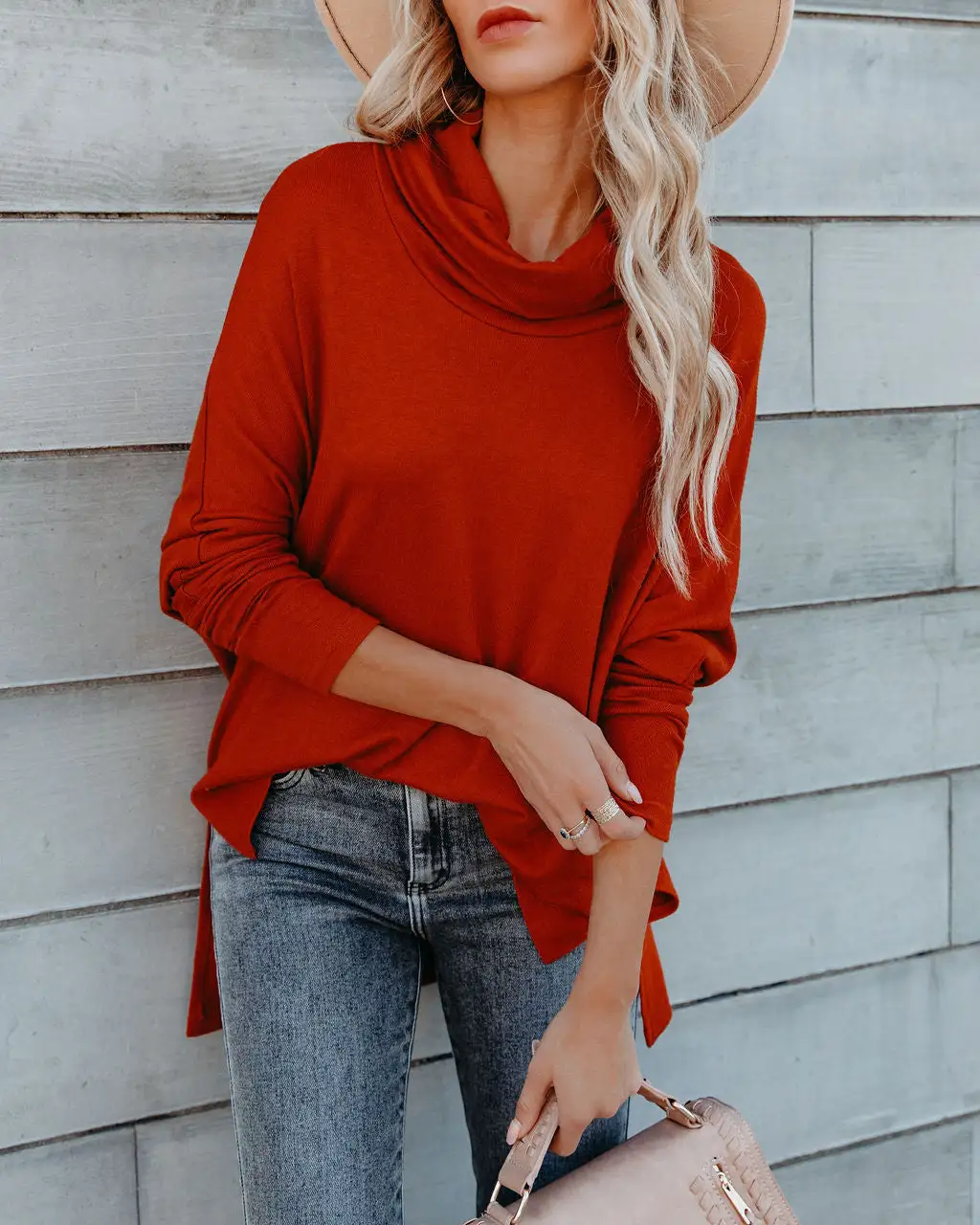 Our Westward Cowl Neck Knit Sweater is a cold weather classic! This brick colored sweater is detailed with a high low hemline. Designed with side slits and long sleeves. Tuck this top into dark wash denim. Styled with the El Dorado Hat, Perfect Hoop Earrings, Highland Bag, Population High Rise Skinny, and Brooks Faux Suede Heeled Slouch Boot.
