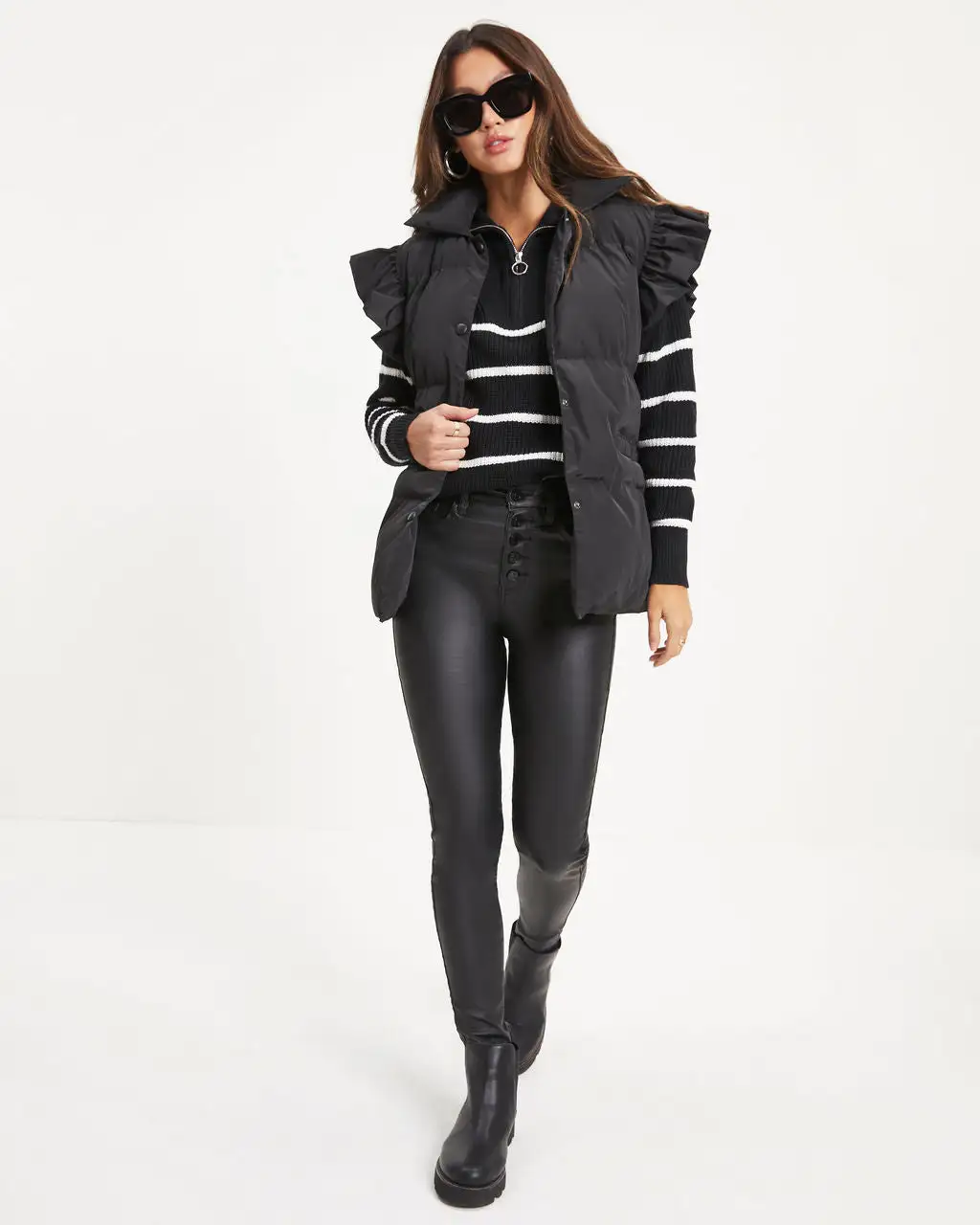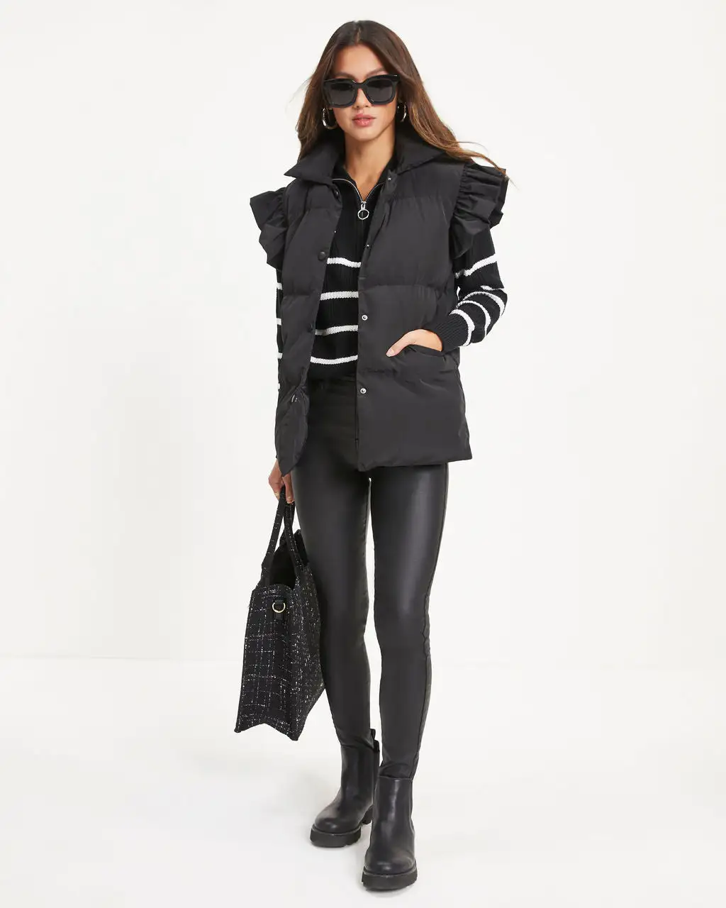 Cute meets cozy in the Winter Glam Pocketed Ruffle Puff Vest in black that features front buttons.