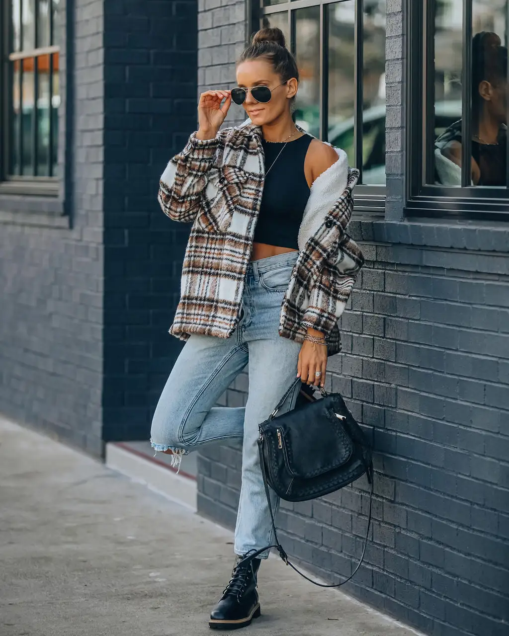 Hit the mountains in our Woodwork Pocketed Sherpa Lined Plaid Shacket! This ivory, black, camel, and mocha plaid shacket is right on trend with its collar and bust pockets. Finished with front button closures and a cream sherpa lined inside. Styled with the Chloe Mini Necklace, The Buddha Wheel Necklace, Highland Bag, Kiki Knit Crop Top, Kason Distressed High Rise Denim, and Brycen Faux Leather Lace Up Boot.