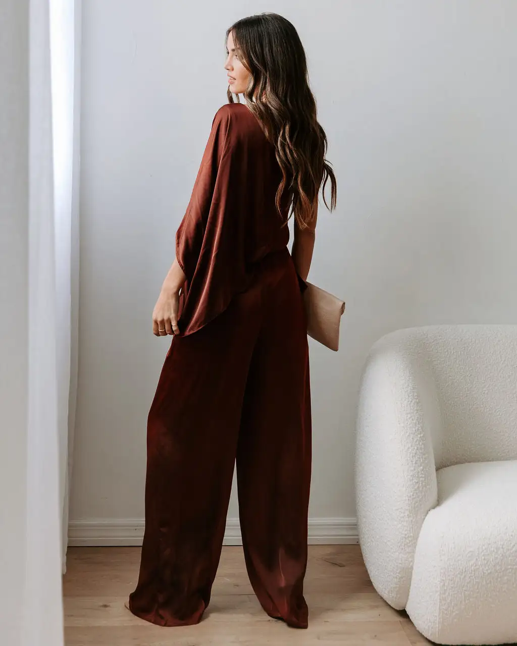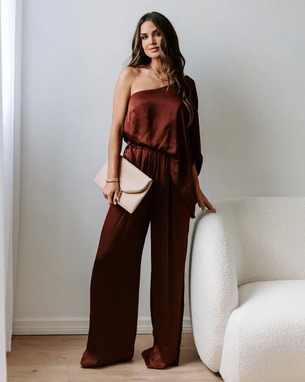 Dress up for the holidays in the Yolanda Satin Pocketed One Shoulder Jumpsuit in brown that features a side tie.