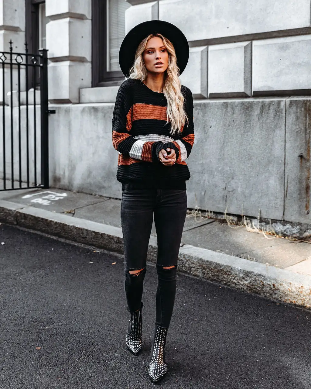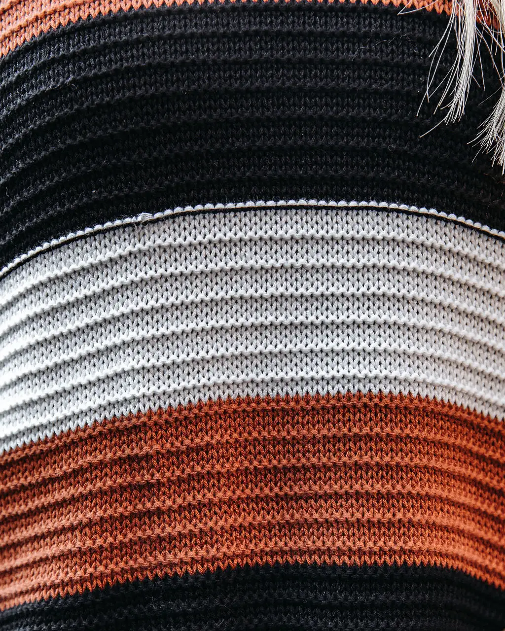 //Best Seller// Cool office days call for the Younes Button Detailed Striped Knit Sweater! Designed with a faux buttoned shoulder that accents the scoop neckline. Horizontal stripes in black, rust and white create an upgraded appeal on the stretchy knit body. A posh and on-trend look to pair with classic denim and faux suede booties all season long.