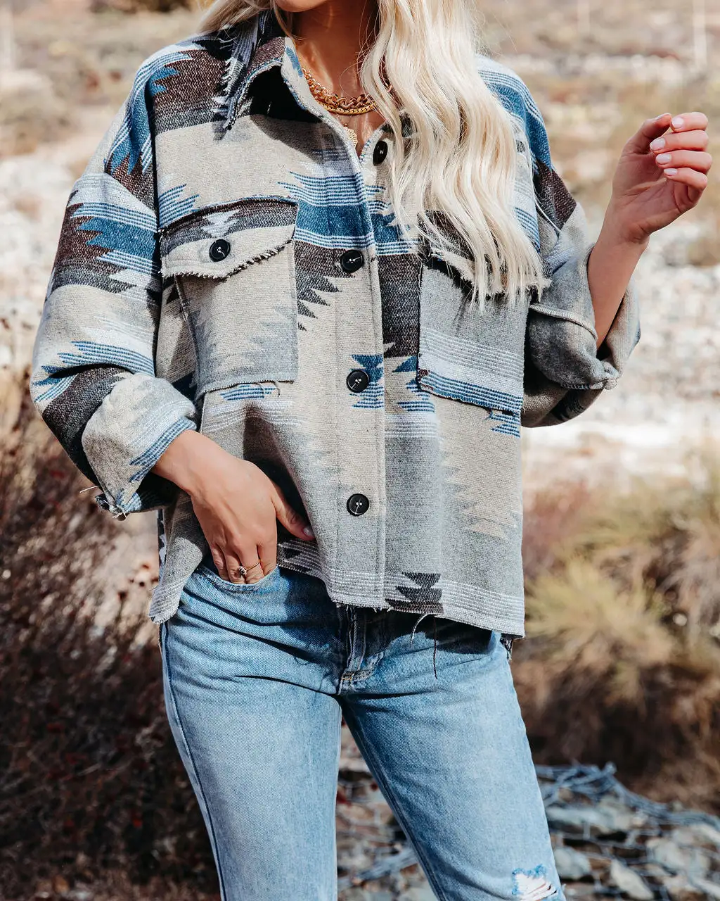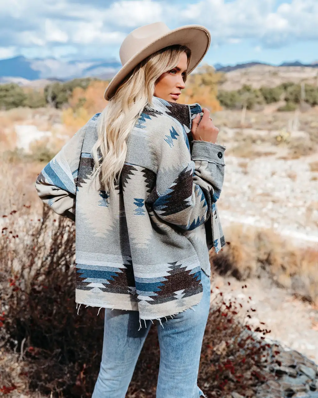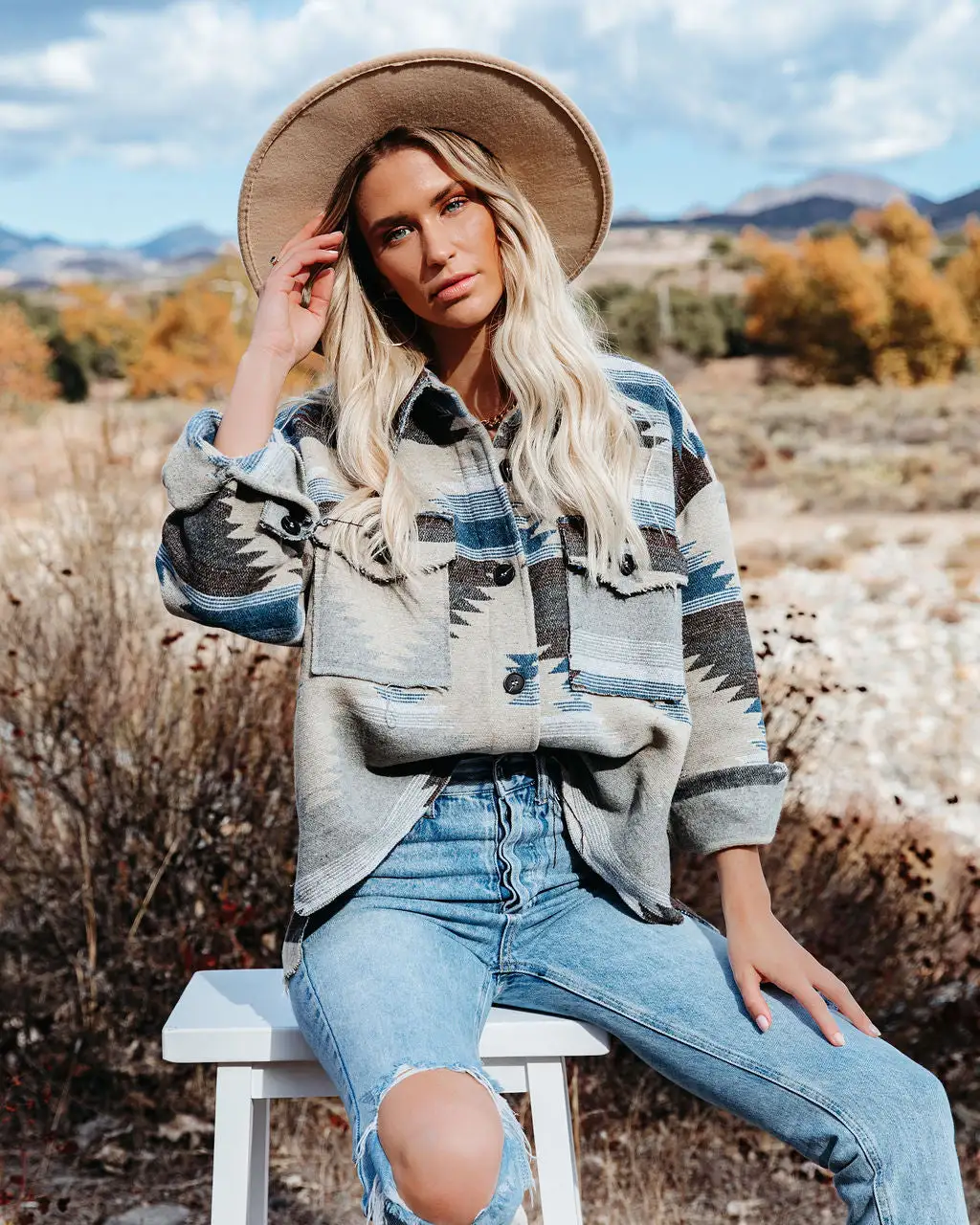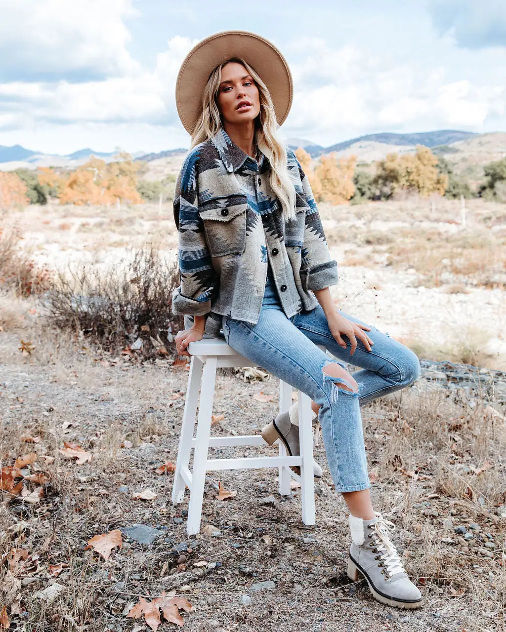 Mountains are calling in this frayed piece! The Zion Distressed Button Down Shacket has a dark teal, charcoal, cream, grey, chocolate, and white aztec pattern. This number looks best worn as a jacket over a classic tee and distressed denim, paired with super on-brand hiking boots. The boyish, boxy structure will make you feel so cool. Styled with the Mercedes Hat, Perfect Hoop Earrings, Mica Chain Choker Necklace, Billie XL Chain, Mosaic Coin Necklace, Physique Racerback Tank, Kason Distressed High Rise Denim, and Conquest Heeled Shearling Lace Up Boot.